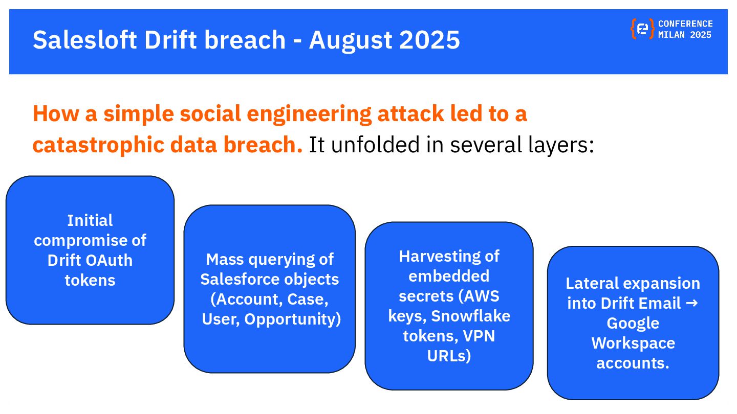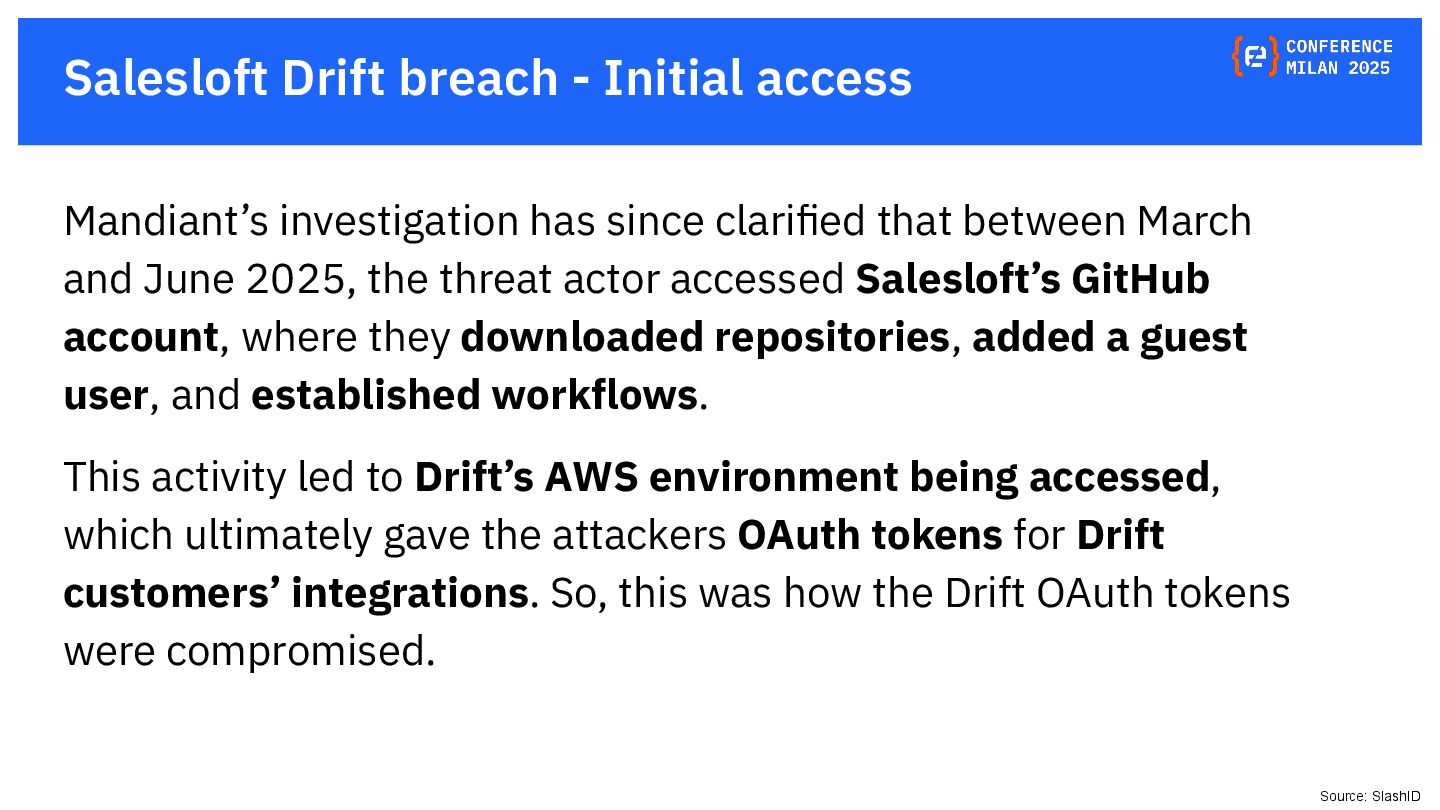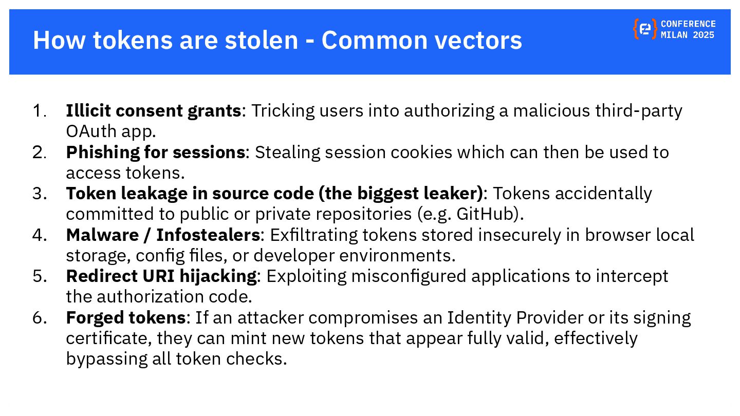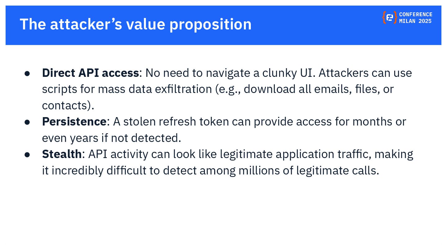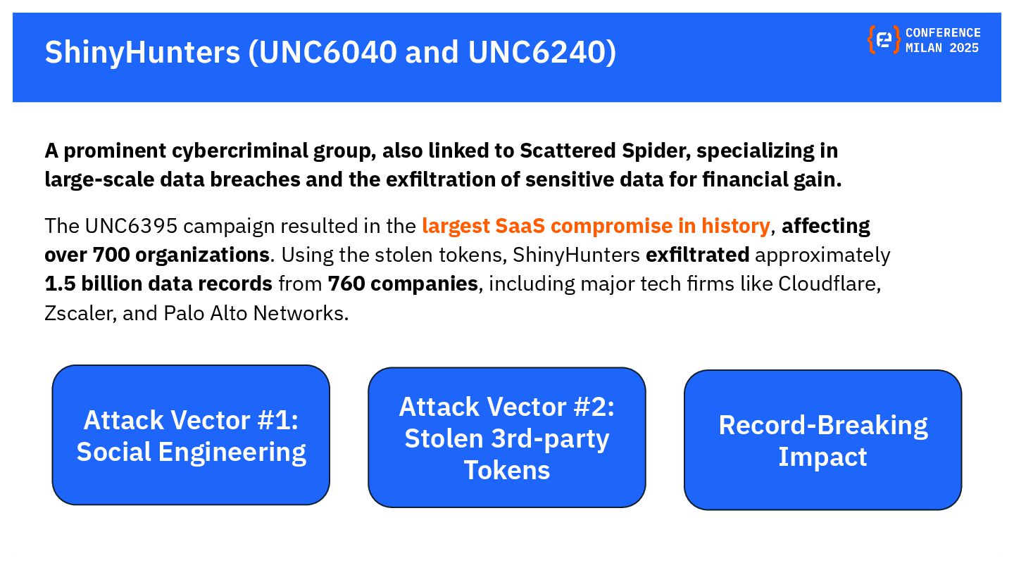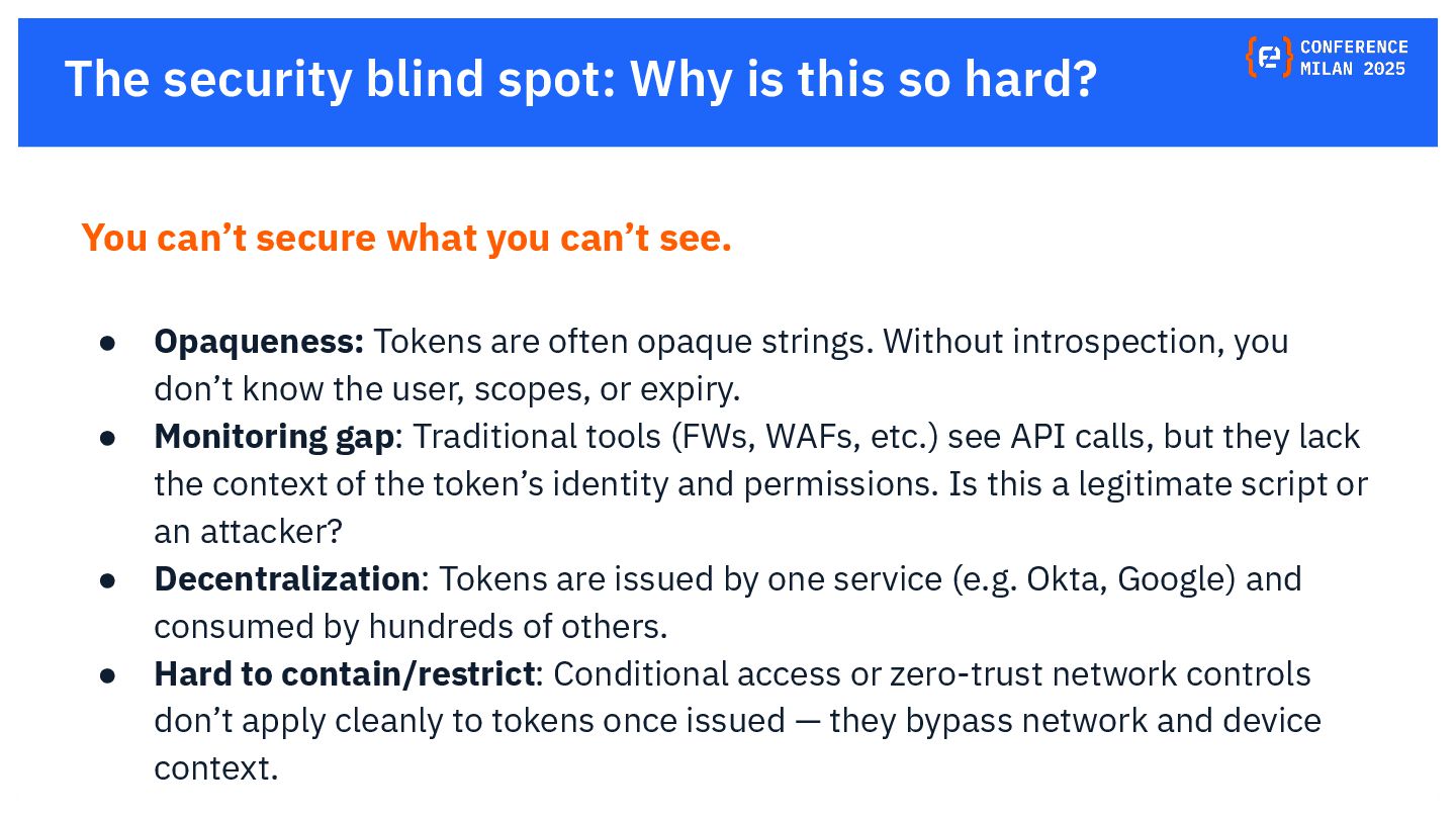 OAuth tokens are the new crown jewels. Once issued, they bypass MFA and give API-level access that is hard to monitor. The opaque nature of their use and the difficulty in monitoring their activity create a dangerous blind spot for security teams, making them a primary target for attackers. This presentation will delve into the lifecycle of OAuth tokens, explore real-world attack vectors, and provide actionable strategies for protecting these high-value assets. We will also review the tactics, techniques, and procedures (TTPs) of notorious gangs like ShinyHunters and Scattered Spider, as demonstrated in the 2025 Salesforce attacks.