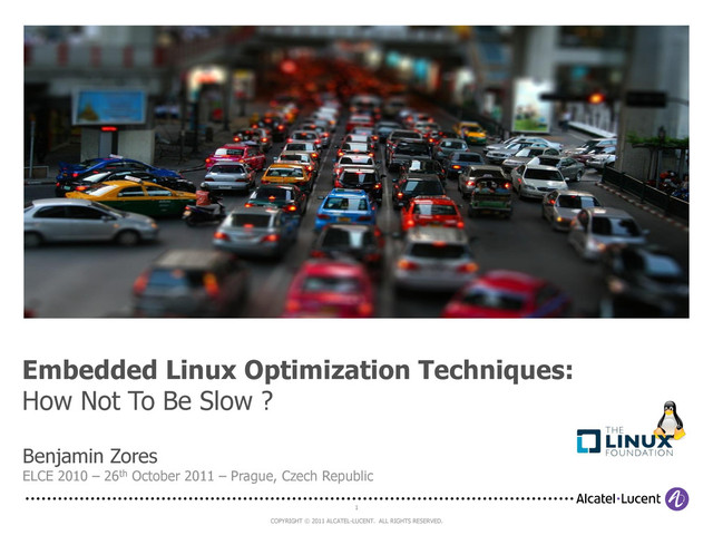 ELCE 2010 – 26th October 2011 – Prague, Czech Republic Embedded Linux Optimization Techniques: How Not To Be Slow ? This is a placeholder image only. Please select an image to reflect the content of your PPT presentation. Visit our approved corporate photography collection on the MarCom Store at: https://all.alcatel-lucent.com/marcomstore/