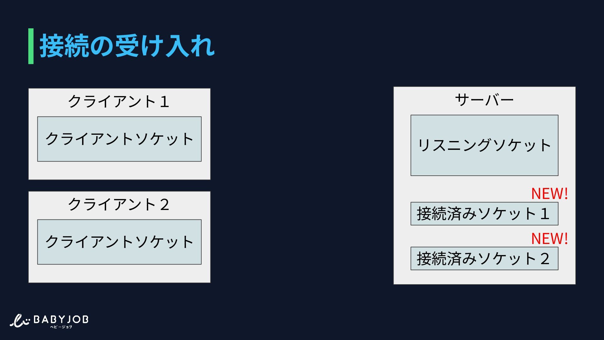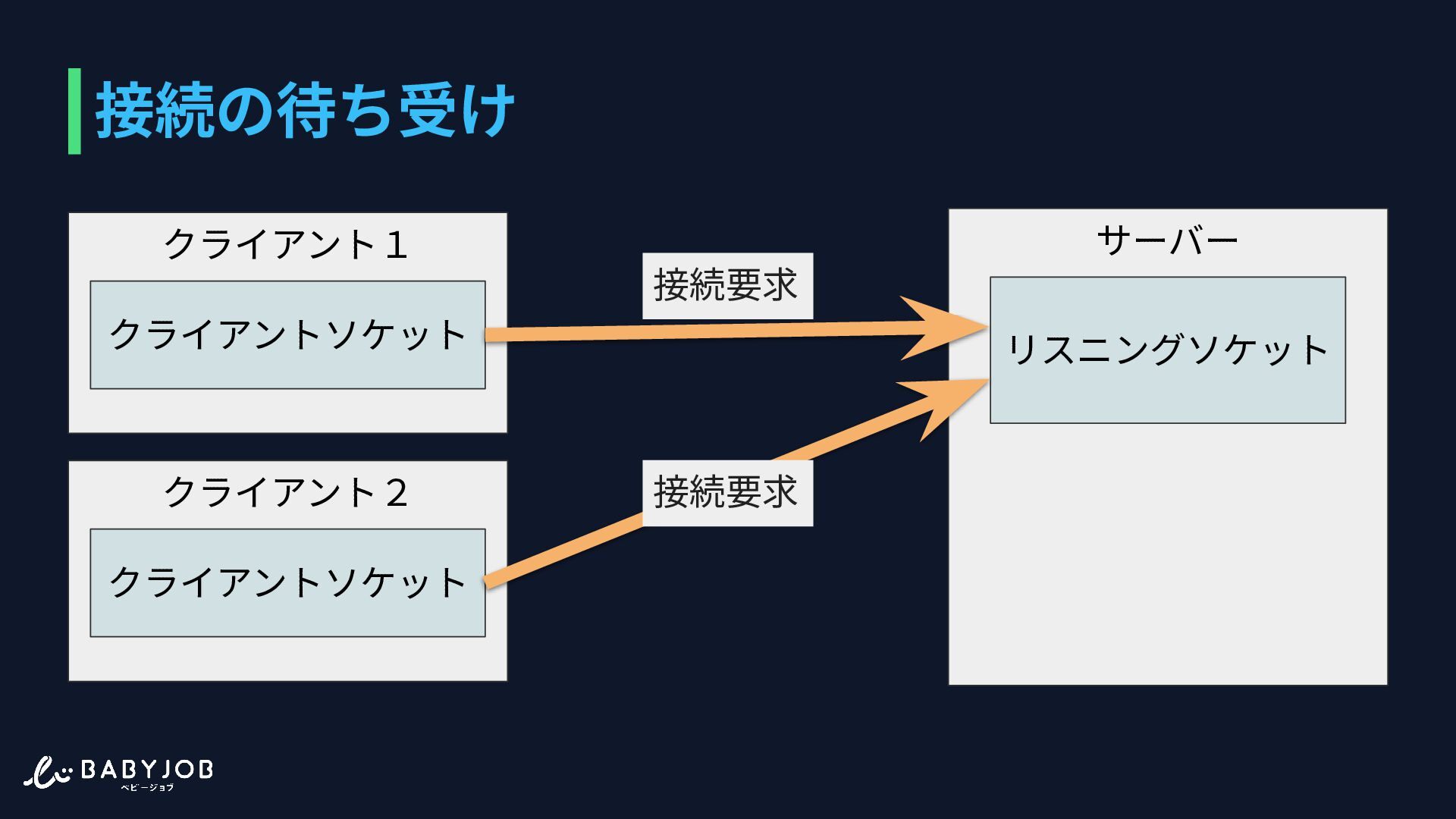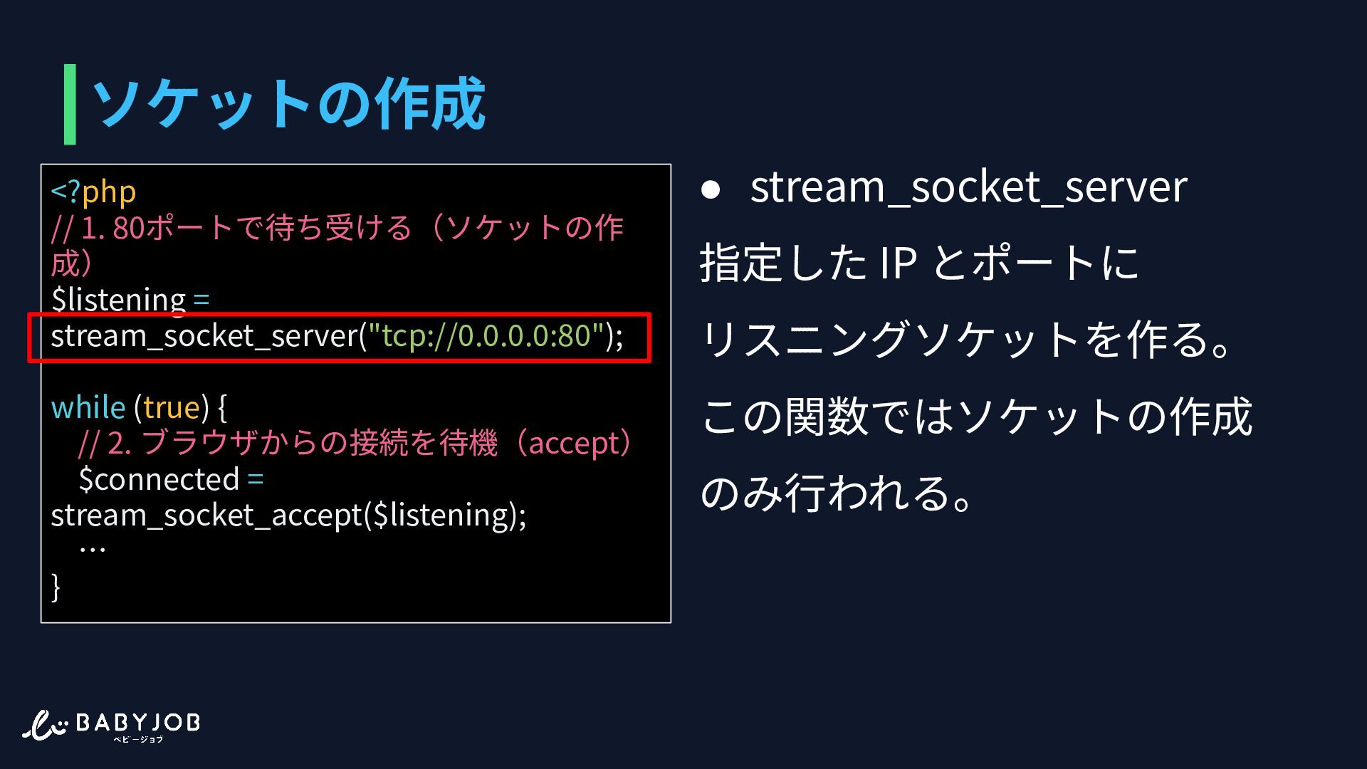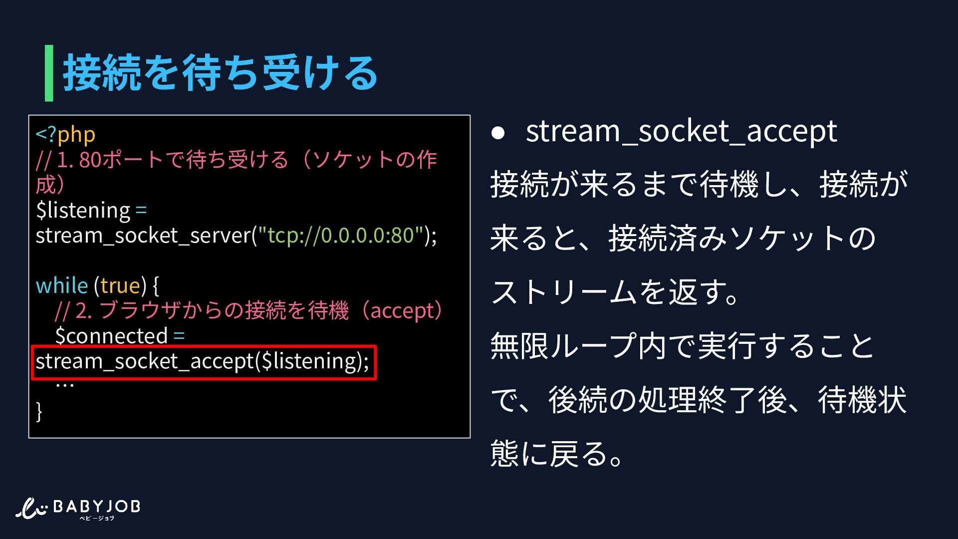 (true) { // 2. ブラウザからの接続を待機(accept) $connected = stream_socket_accept($listening); … } • stream_socket_server 指定した IP とポートに リスニングソケットを作る。 この関数ではソケットの作成 のみ⾏われる。