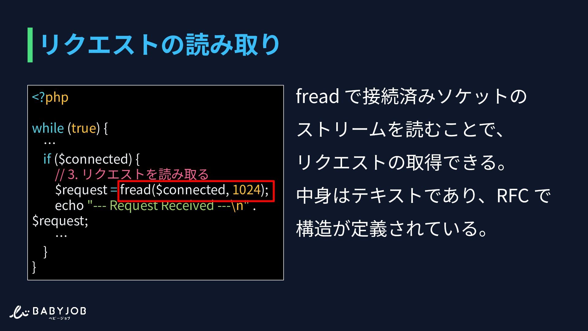 リクエストを読み取る $request = fread($connected, 1024); echo "--- Request Received ---\n" . $request; … } } リクエストの読み取り fread で接続済みソケットの ストリームを読むことで、 リクエストの取得できる。 中⾝はテキストであり、RFC で 構造が定義されている。