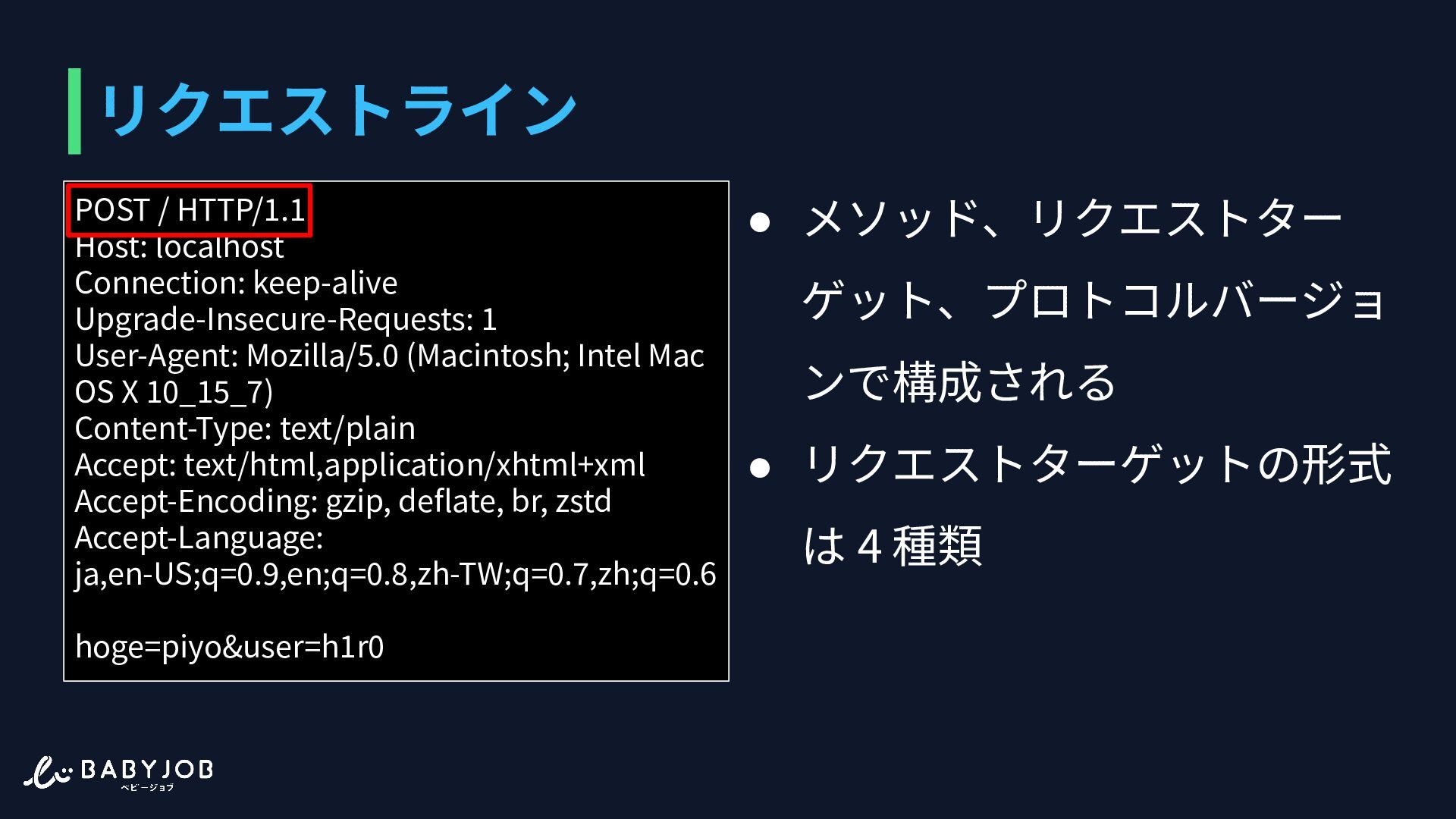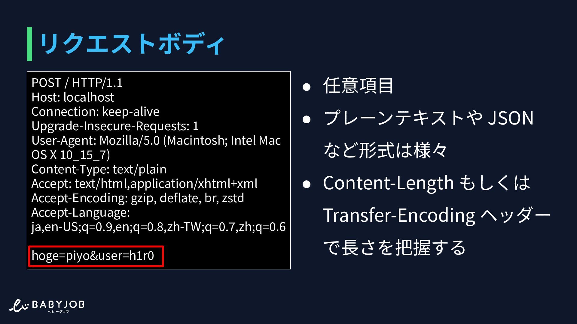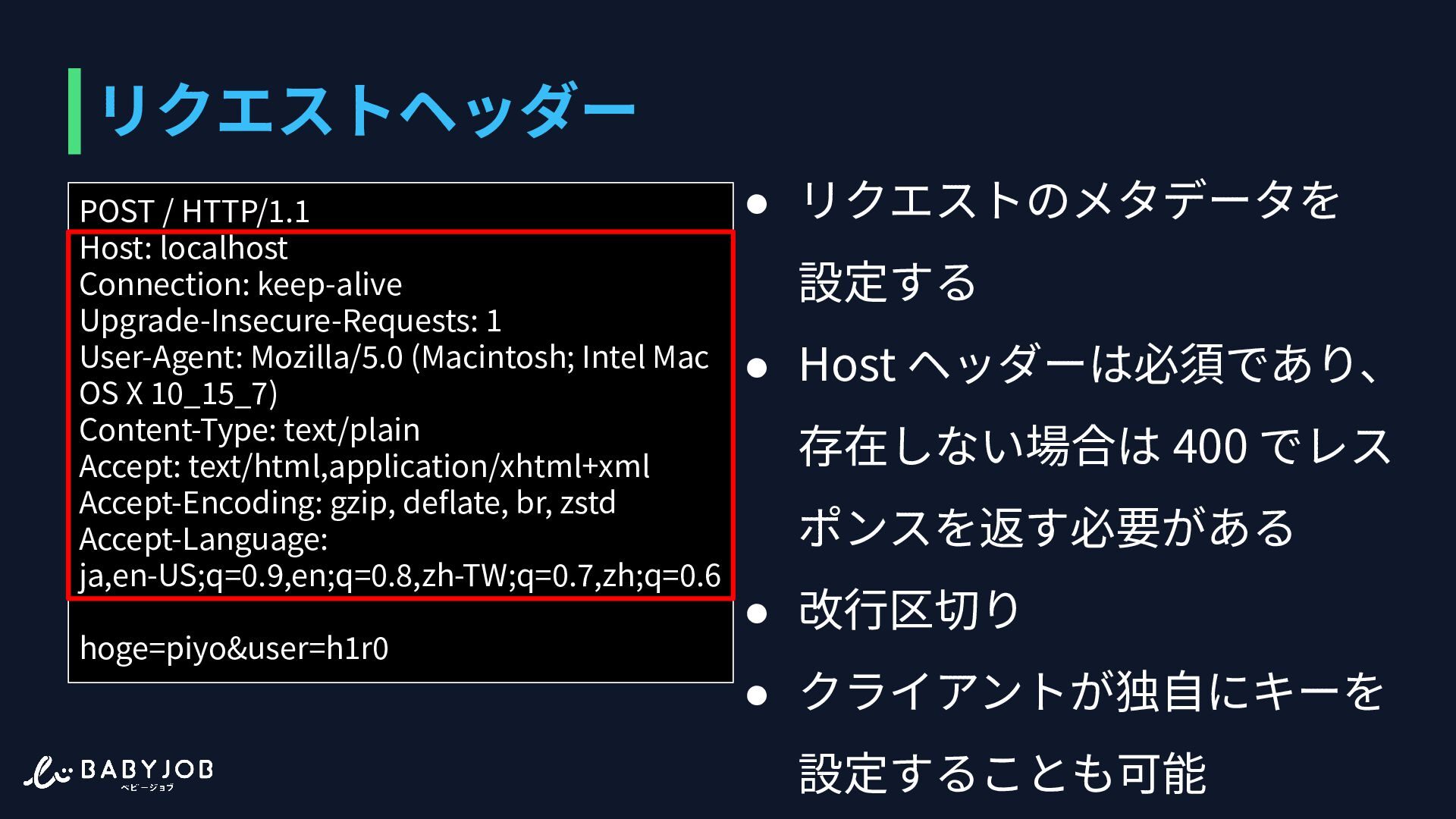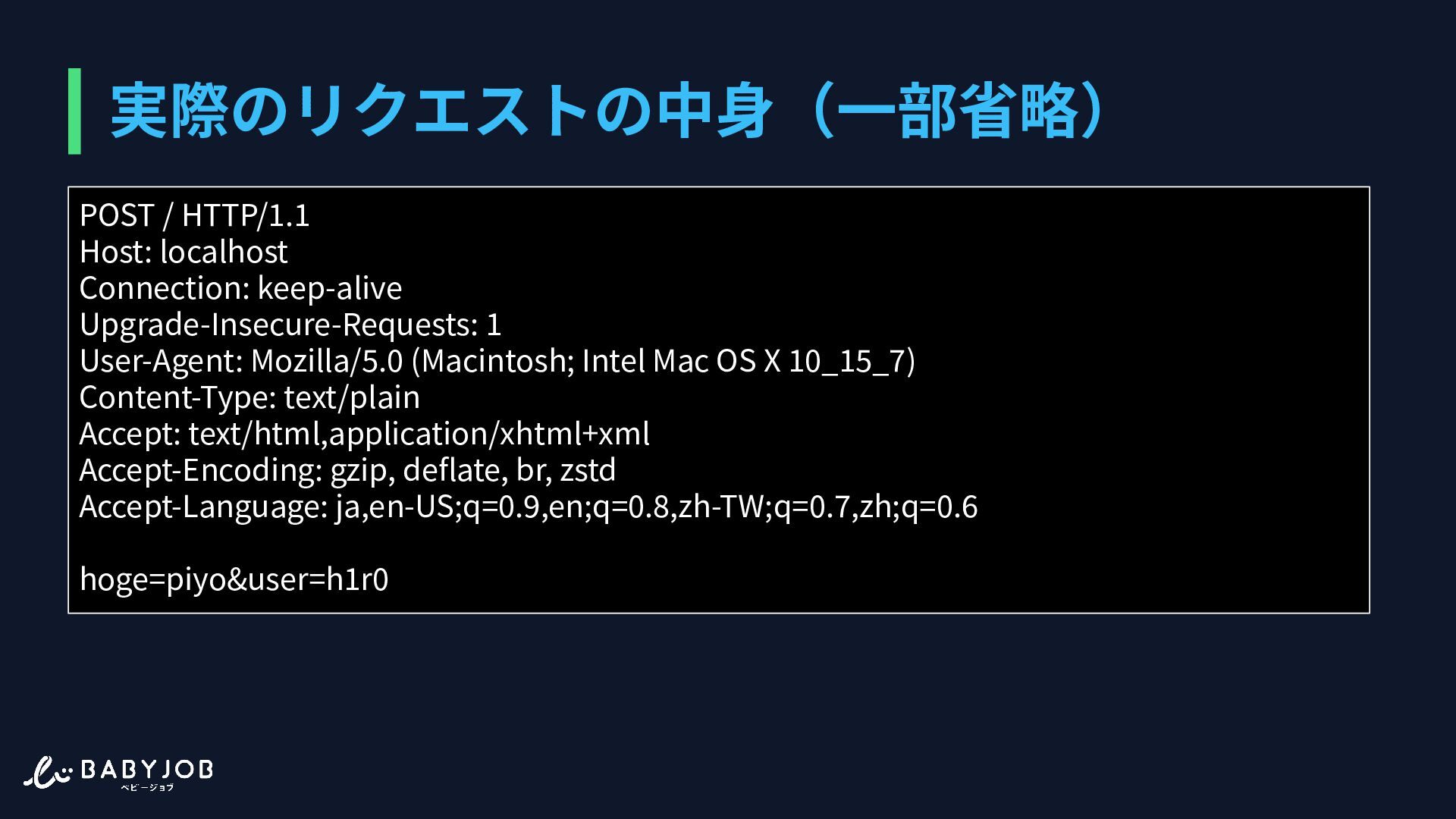ポンスを返す必要がある • 改⾏区切り • クライアントが独⾃にキーを 設定することも可能 POST / HTTP/1.1 Host: localhost Connection: keep-alive Upgrade-Insecure-Requests: 1 User-Agent: Mozilla/5.0 (Macintosh; Intel Mac OS X 10_15_7) Content-Type: text/plain Accept: text/html,application/xhtml+xml Accept-Encoding: gzip, deflate, br, zstd Accept-Language: ja,en-US;q=0.9,en;q=0.8,zh-TW;q=0.7,zh;q=0.6 hoge=piyo&user=h1r0