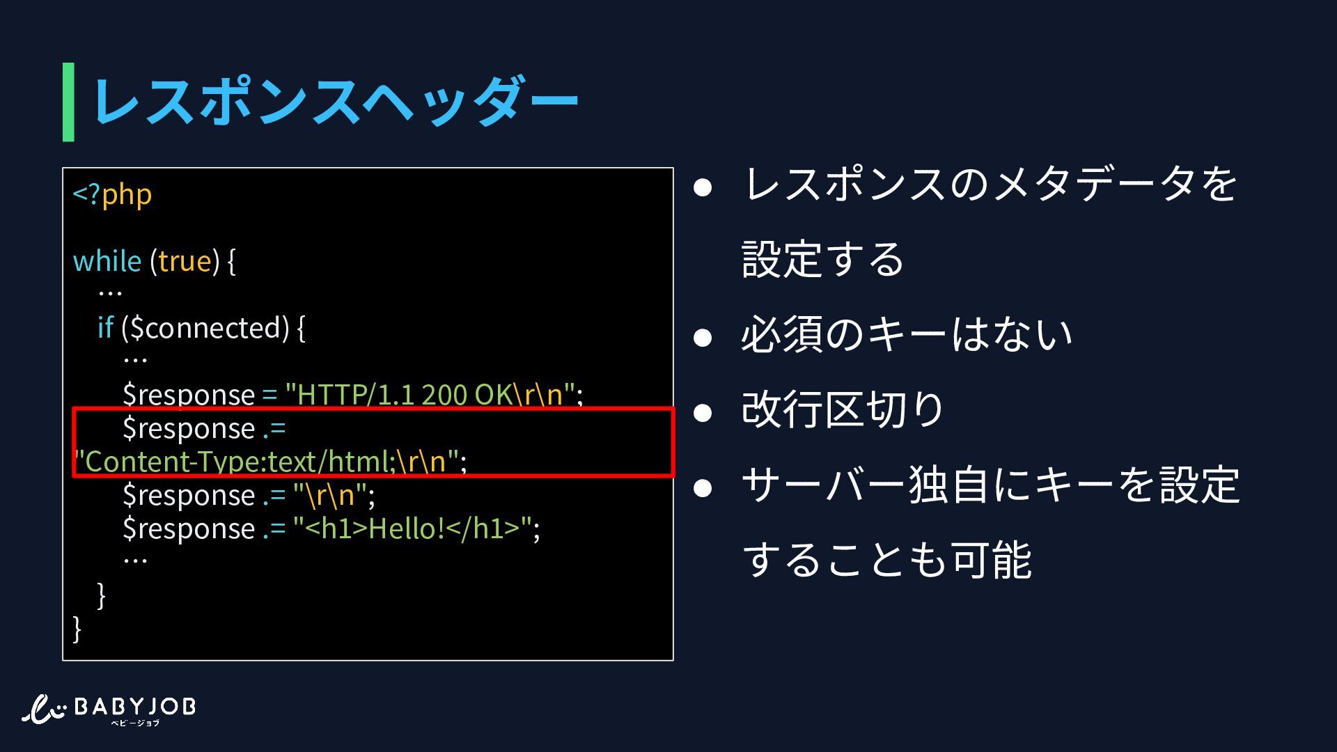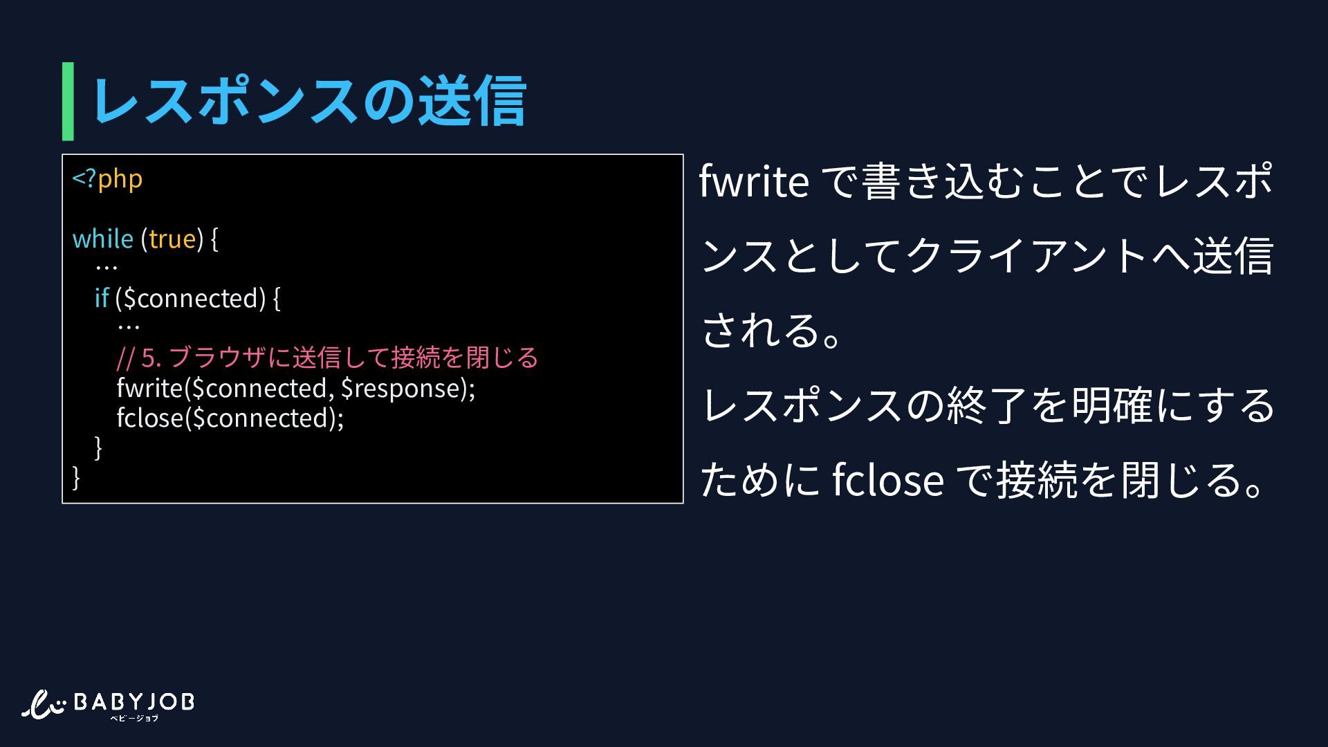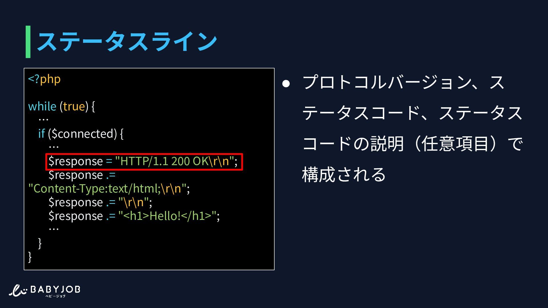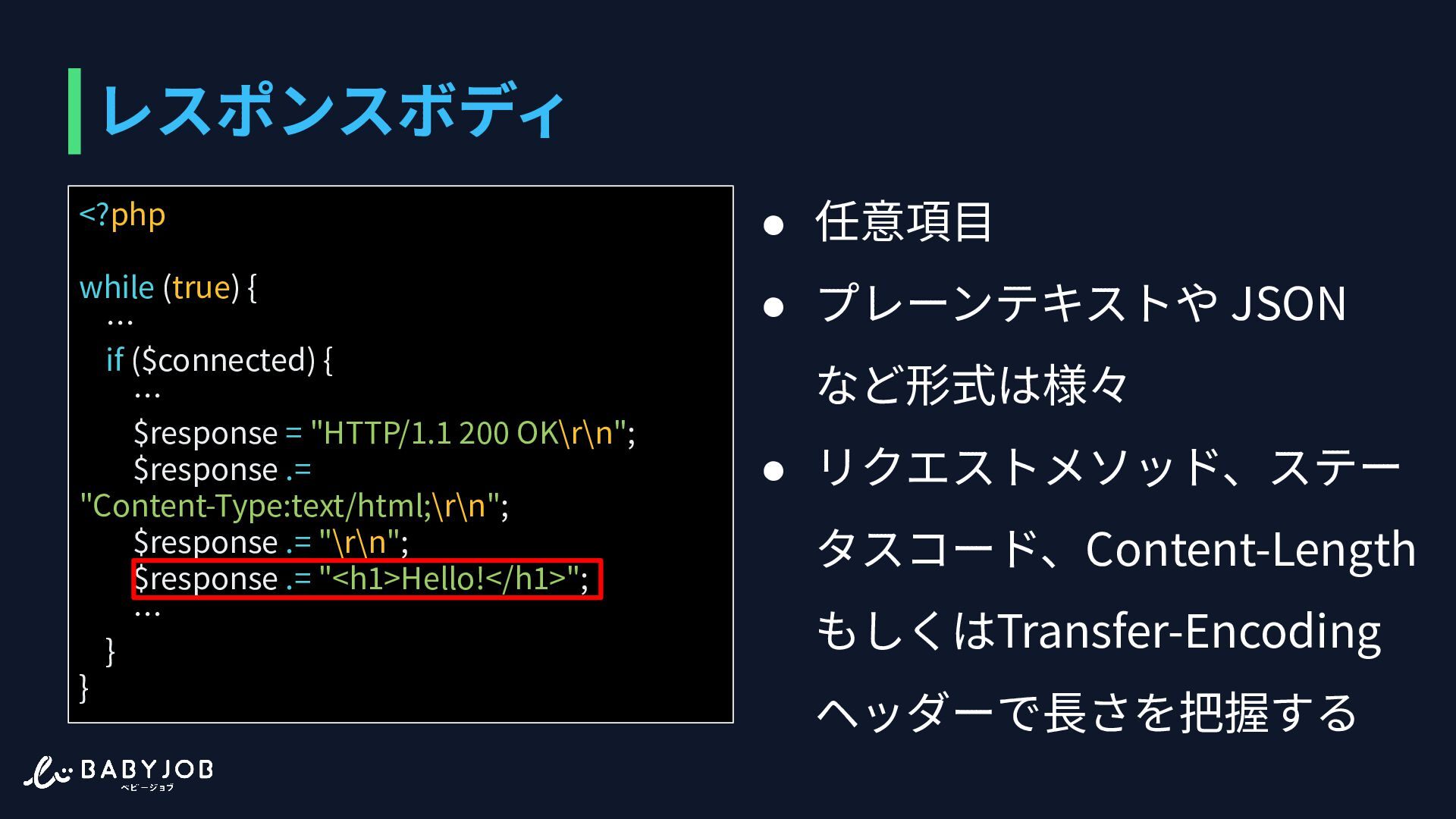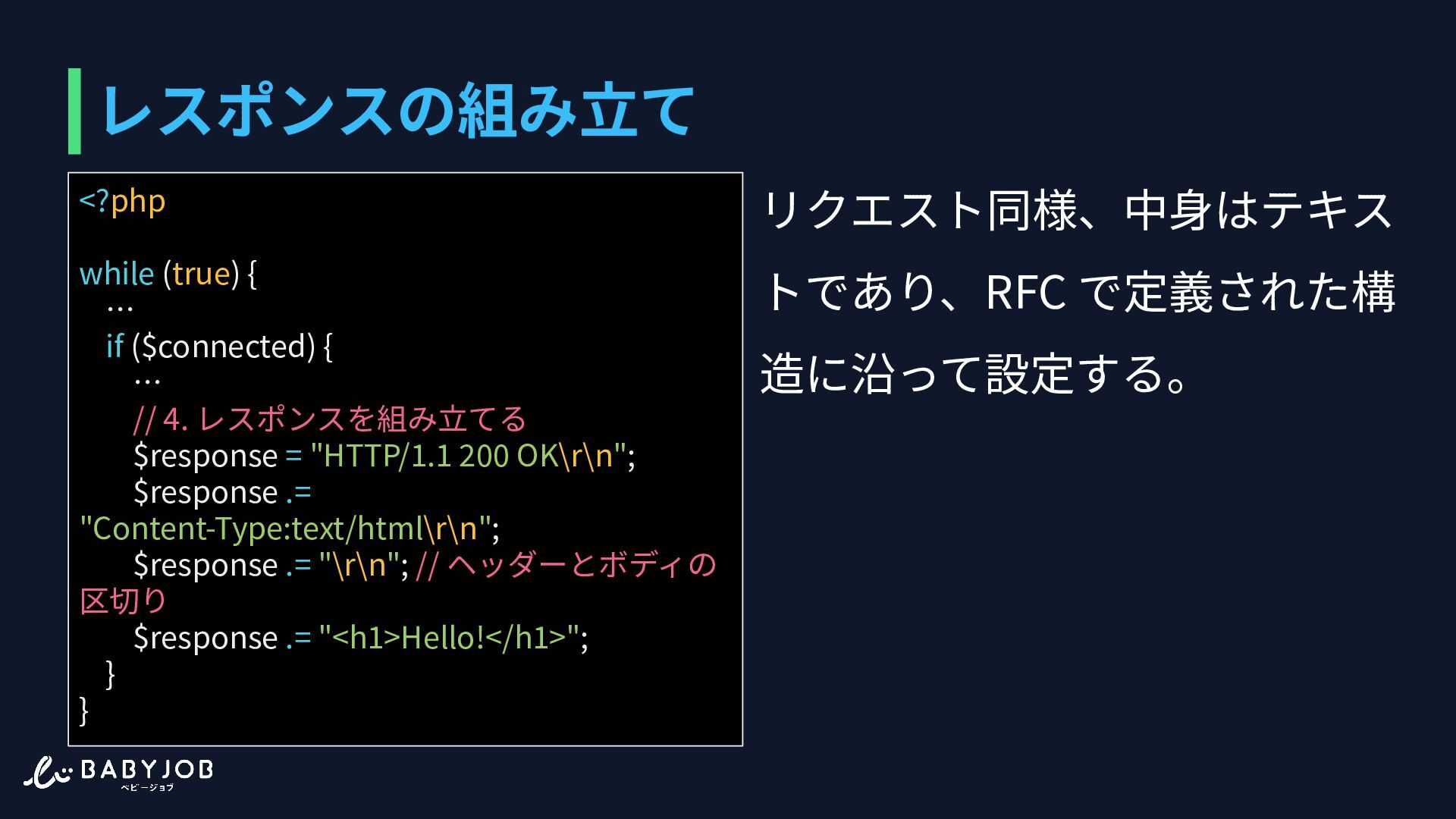もしくはTransfer-Encoding ヘッダーで⻑さを把握する <?php while (true) { … if ($connected) { … $response = "HTTP/1.1 200 OK\r\n"; $response .= "Content-Type:text/html;\r\n"; $response .= "\r\n"; $response .= "<h1>Hello!</h1>"; … } }