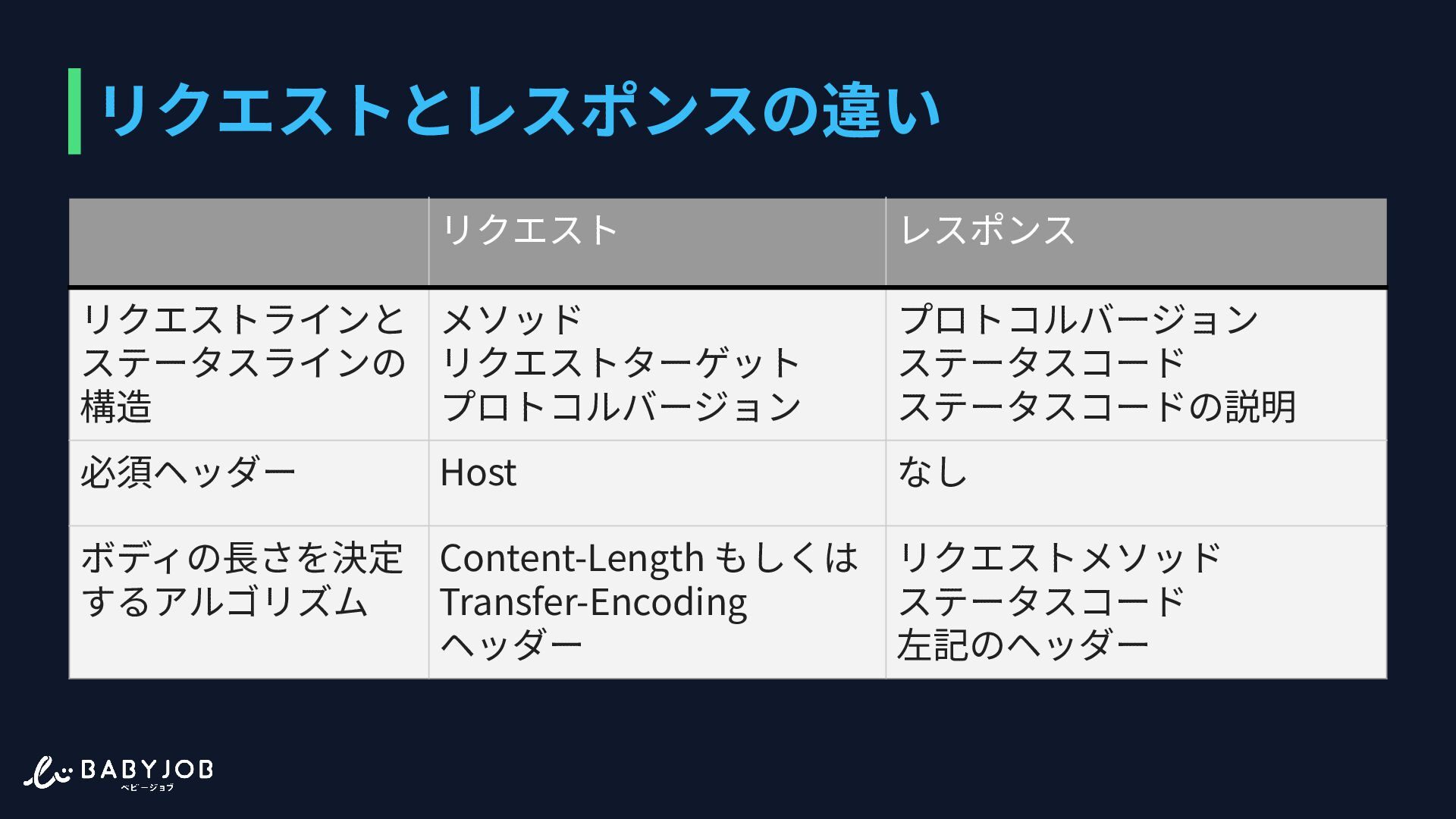 ステータスコード ステータスコードの説明 必須ヘッダー Host なし ボディの⻑さを決定 するアルゴリズム Content-Length もしくは Transfer-Encoding ヘッダー リクエストメソッド ステータスコード 左記のヘッダー