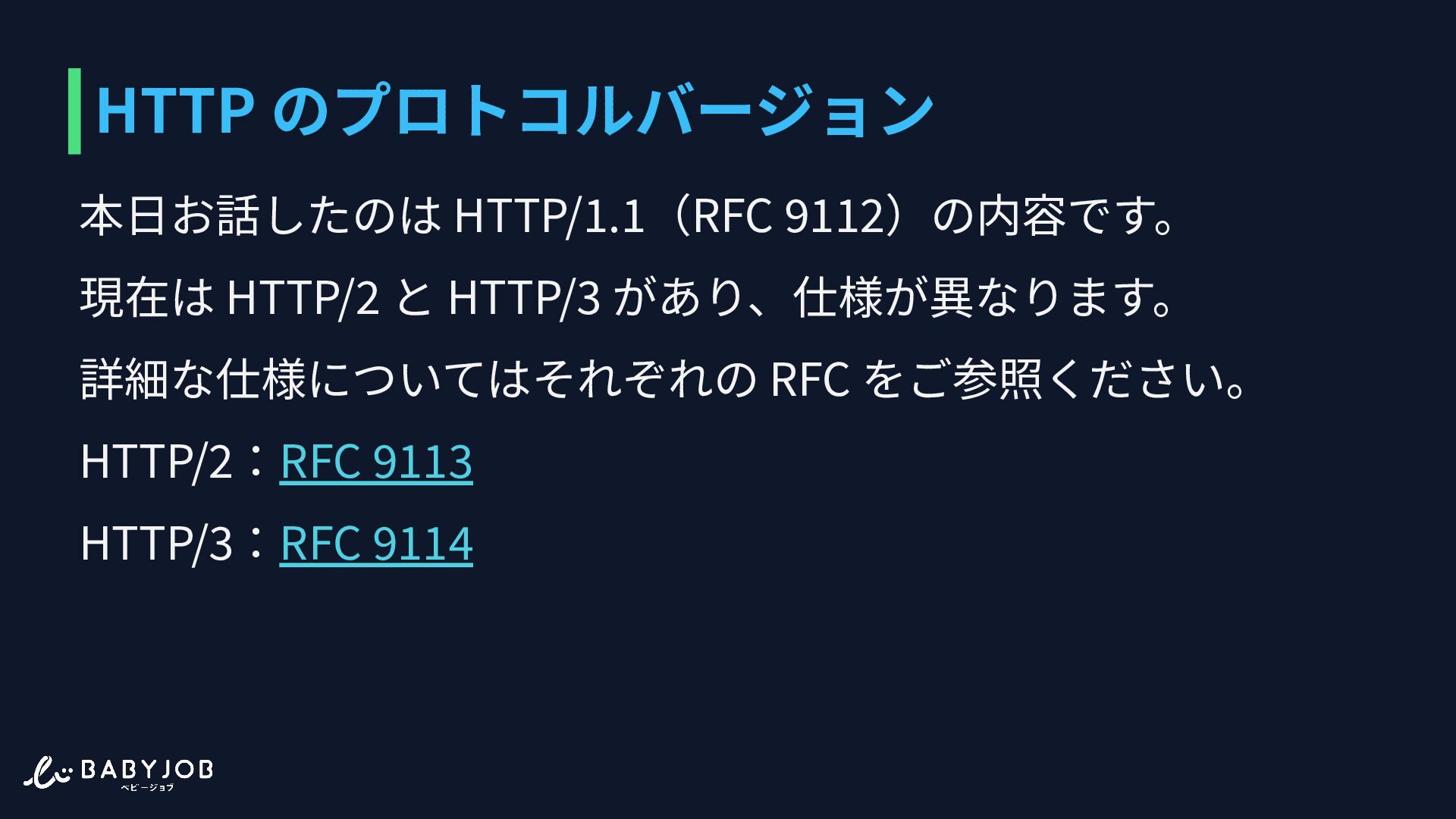 17. HTTP のプロトコルバージョン 本⽇お話したのは HTTP/1.1(RFC 9112)の内容です。 現在は HTTP/2 と HTTP/3 があり、仕様が異なります。