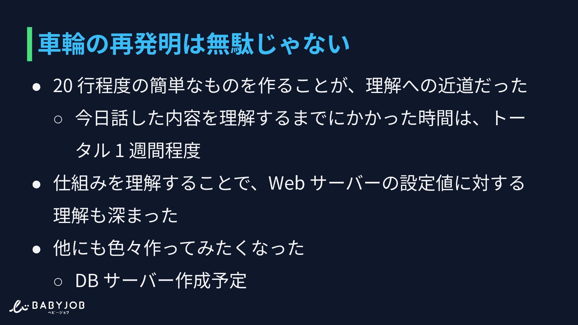 仕組みを理解することで、Web サーバーの設定値に対する 理解も深まった • 他にも⾊々作ってみたくなった ◦ DB サーバー作成予定