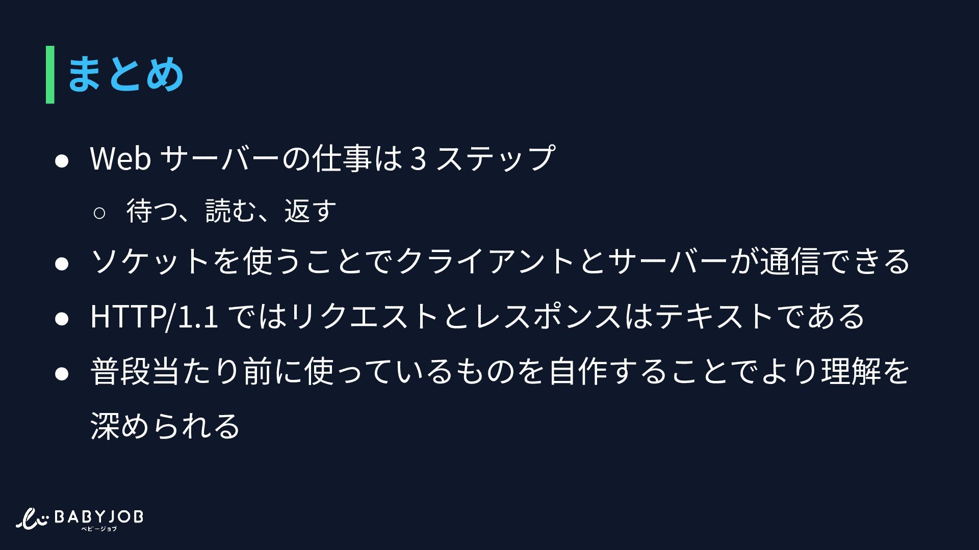 19. まとめ • Web サーバーの仕事は 3 ステップ ◦ 待つ、読む、返す • ソケットを使うことでクライアントとサーバーが通信できる