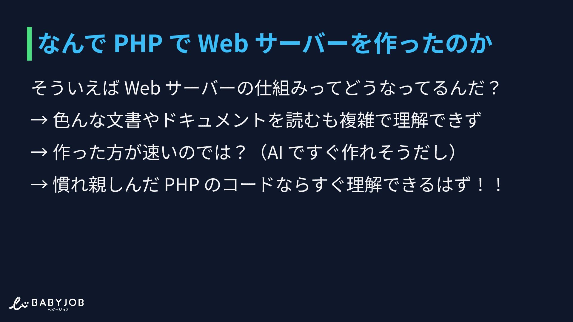 1. なんで PHP で Web サーバーを作ったのか そういえば Web サーバーの仕組みってどうなってるんだ? → ⾊んなドキュメントを読むも複雑で理解できず