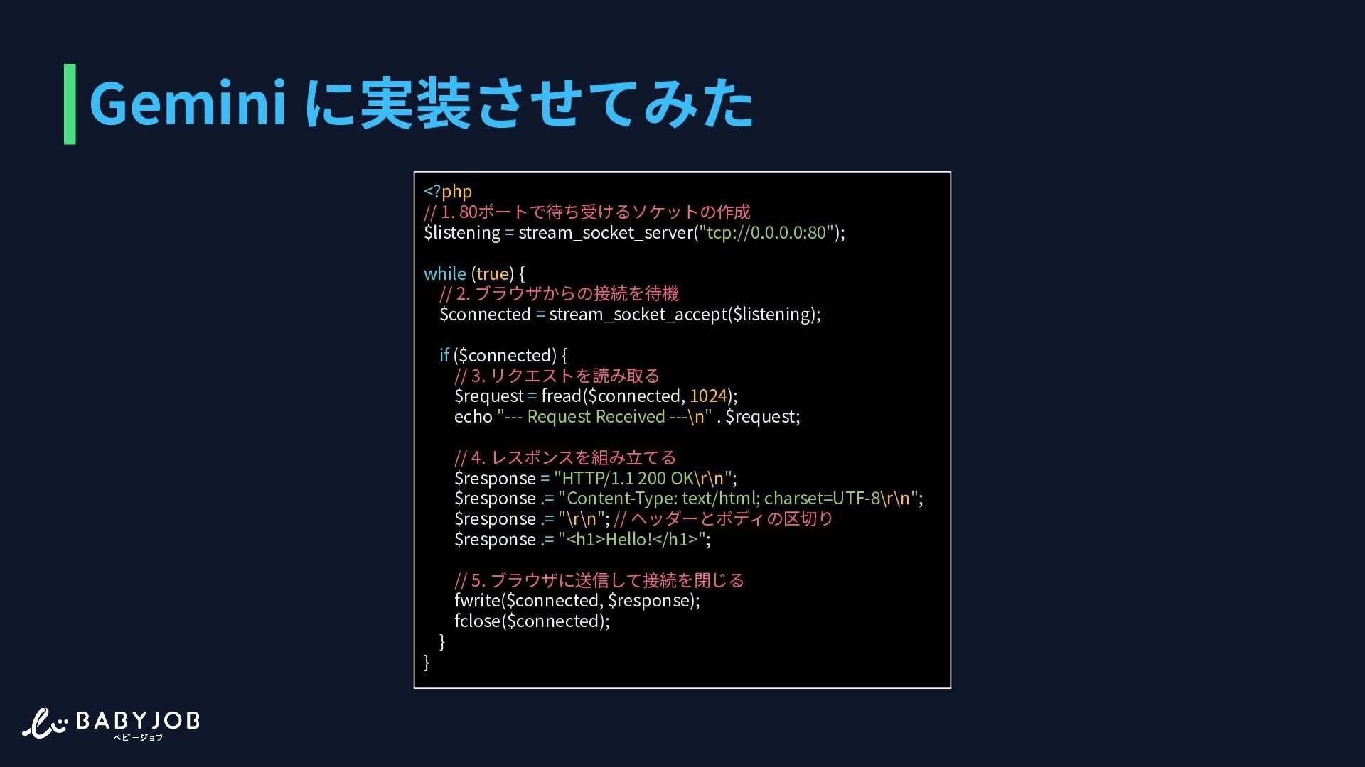 2. Gemini に実装させてみた <?php // 1. 80ポートで待ち受けるソケットの作成 $listening = stream_socket_server("tcp://0.0.0.0:80"); while