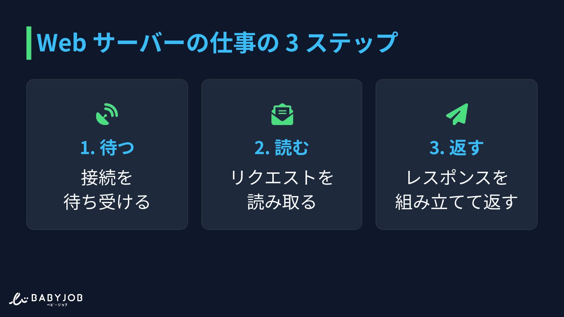 3. 1. 待つ 接続を 待ち受ける 2. 読む リクエストを 読み取る 3. 返す