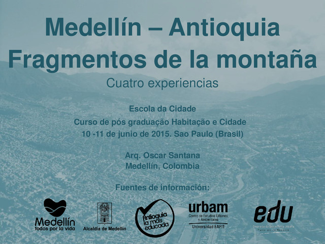 10 -11 de junio de 2015. Sao Paulo (Brasil) Arq. Oscar Santana Medellín, Colombia Fuentes de información: Medellín – Antioquia Fragmentos de la montaña Cuatro experiencias