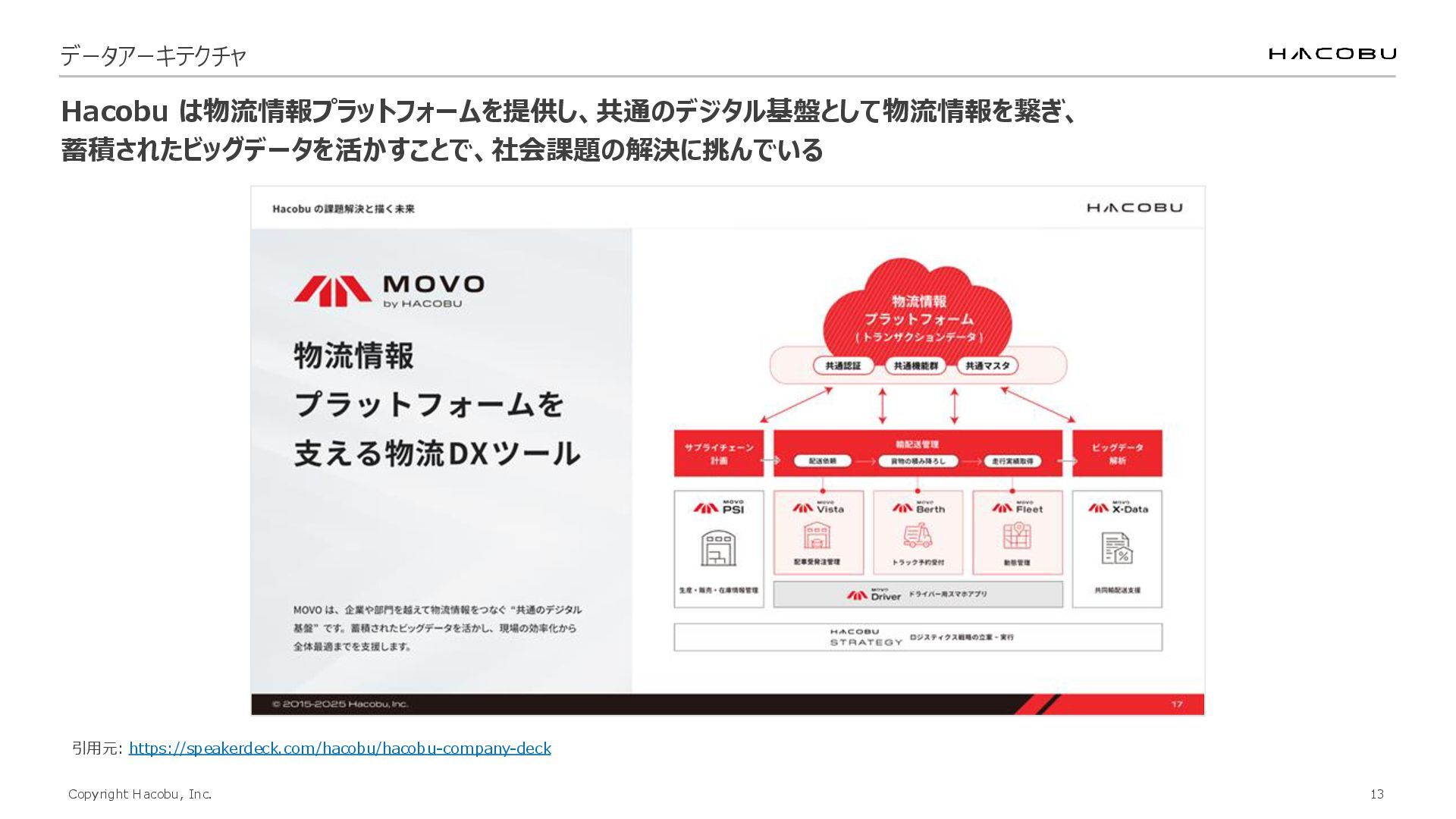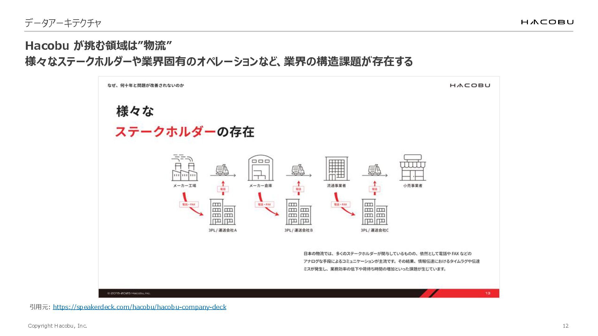 Copyright Hacobu, Inc. 12 データアーキテクチャ Hacobu が挑む領域は”物流” 様々なステークホルダーや業界固有のオペレーションなど、業界の構造課題が存在する 引用元: https://speakerdeck.com/hacobu/hacobu-company-deck