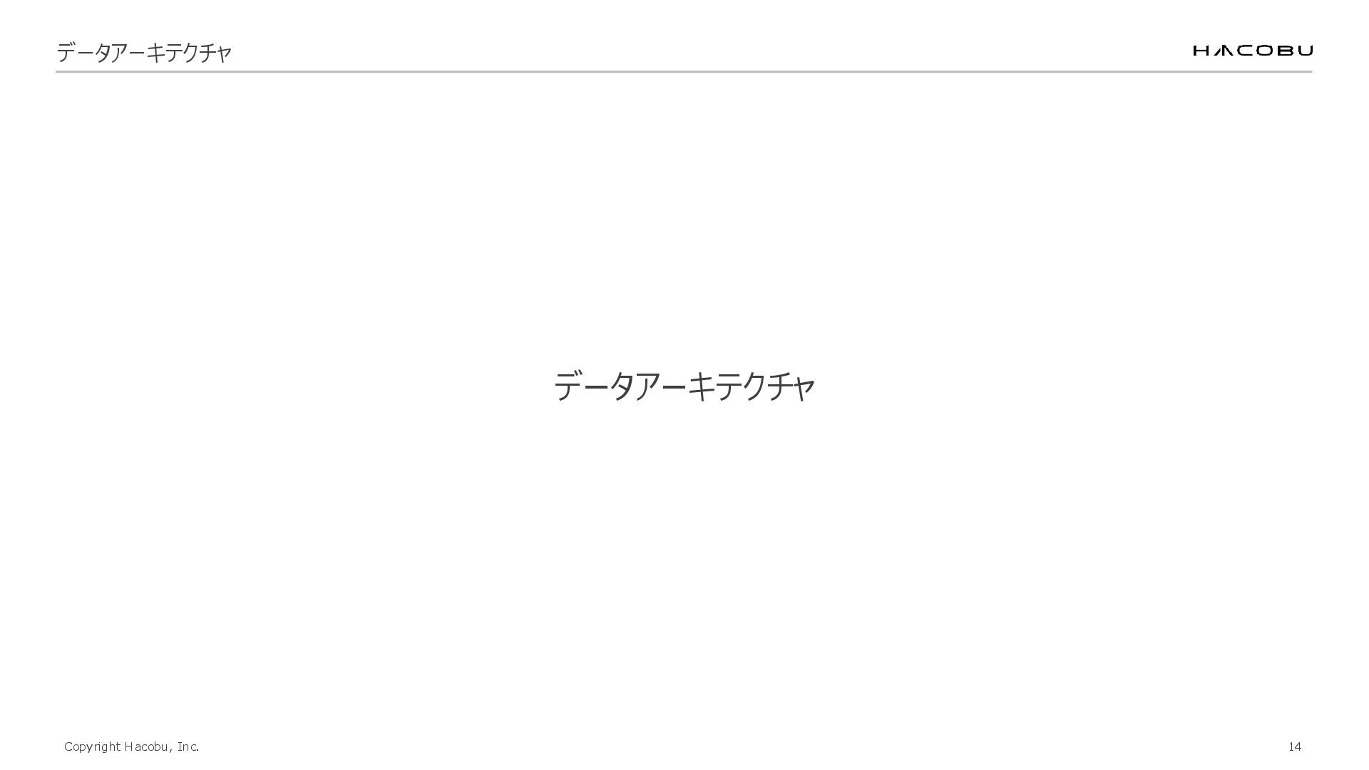 Copyright Hacobu, Inc. 13 データアーキテクチャ Hacobu は物流情報プラットフォームを提供し、共通のデジタル基盤として物流情報を繋ぎ、 蓄積されたビッグデータを活かすことで、社会課題の解決に挑んでいる 引用元: https://speakerdeck.com/hacobu/hacobu-company-deck