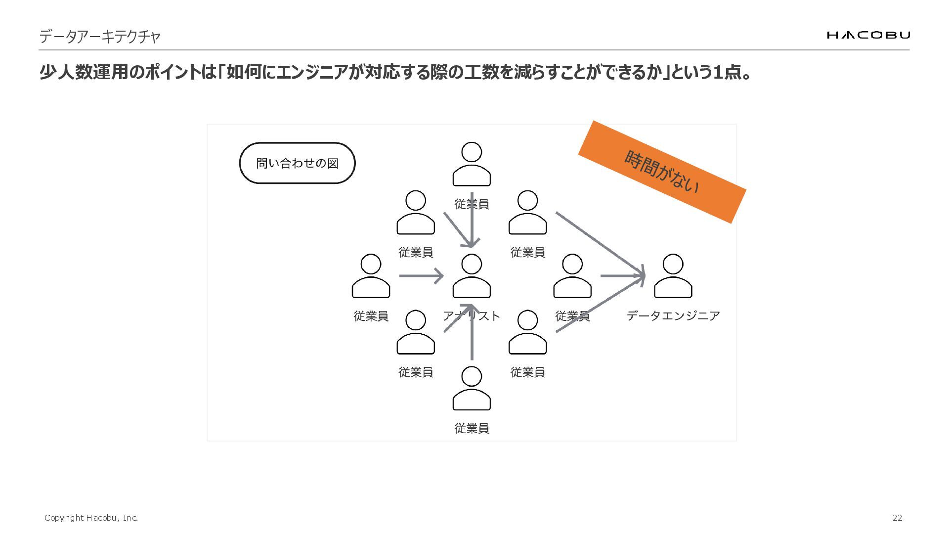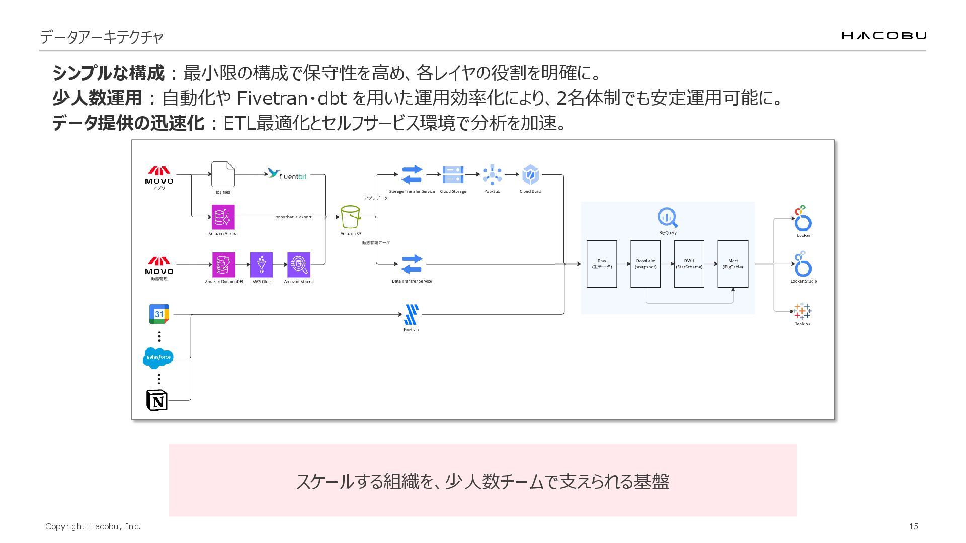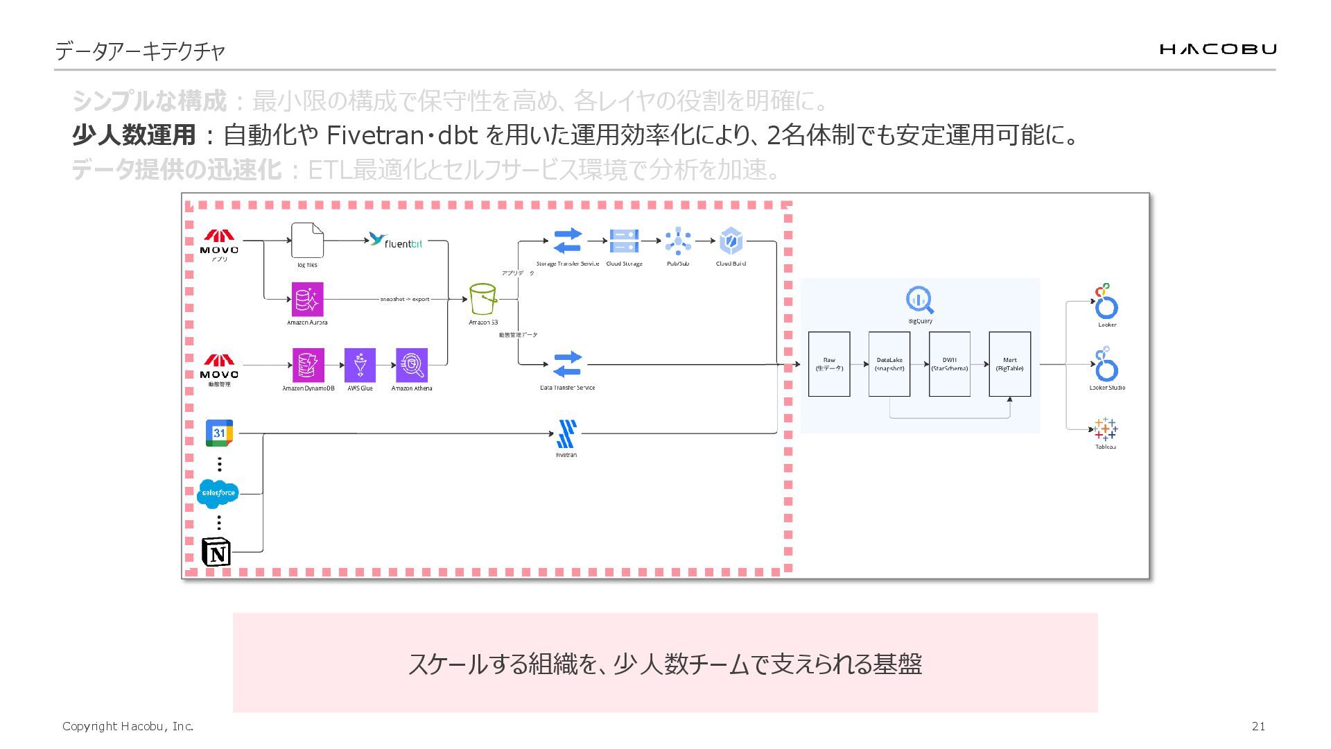 Copyright Hacobu, Inc. 21 データアーキテクチャ シンプルな構成:最小限の構成で保守性を高め、各レイヤの役割を明確に。 少人数運用:自動化や Fivetran・dbt を用いた運用効率化により、2名体制でも安定運用可能に。 データ提供の迅速化:ETL最適化とセルフサービス環境で分析を加速。