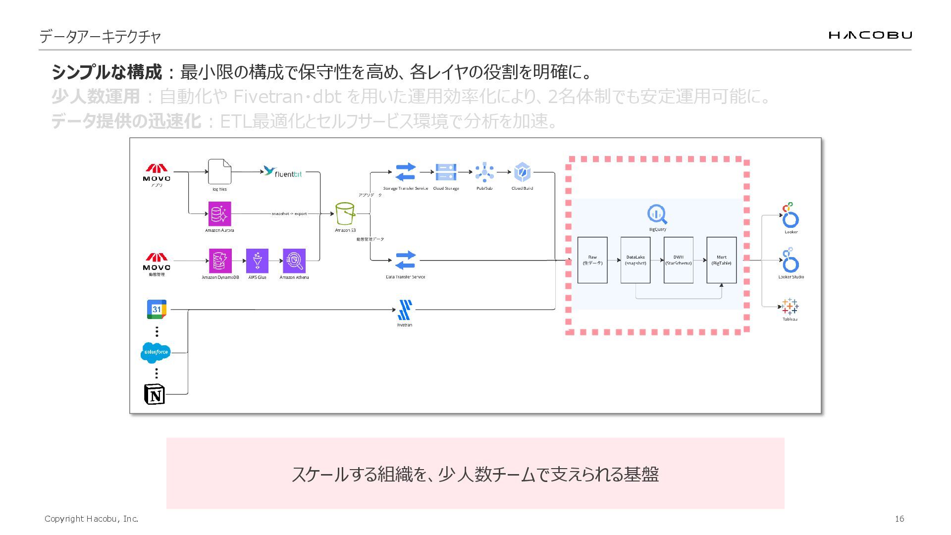 Copyright Hacobu, Inc. 15 データアーキテクチャ シンプルな構成:最小限の構成で保守性を高め、各レイヤの役割を明確に。 少人数運用:自動化や Fivetran・dbt を用いた運用効率化により、2名体制でも安定運用可能に。 データ提供の迅速化:ETL最適化とセルフサービス環境で分析を加速。