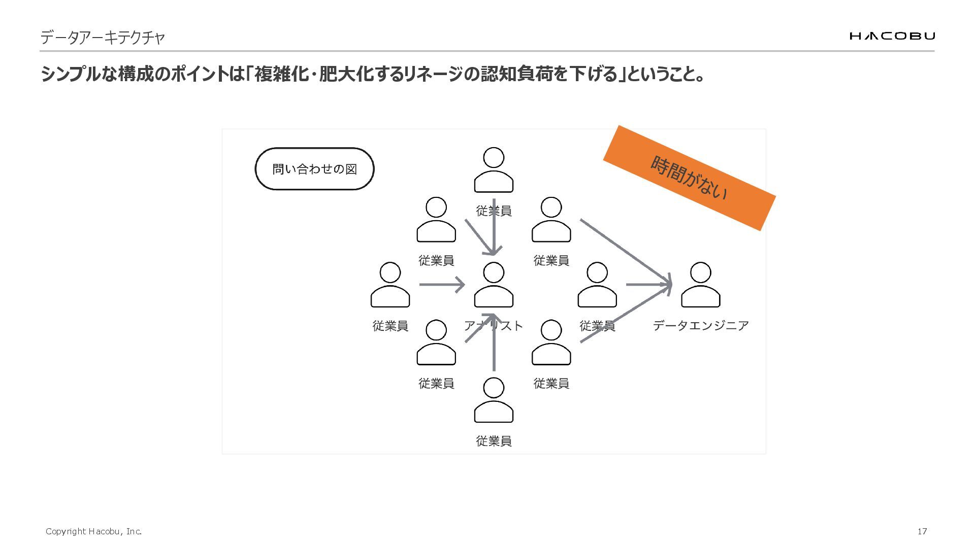 Copyright Hacobu, Inc. 16 データアーキテクチャ シンプルな構成:最小限の構成で保守性を高め、各レイヤの役割を明確に。 少人数運用:自動化や Fivetran・dbt を用いた運用効率化により、2名体制でも安定運用可能に。 データ提供の迅速化:ETL最適化とセルフサービス環境で分析を加速。