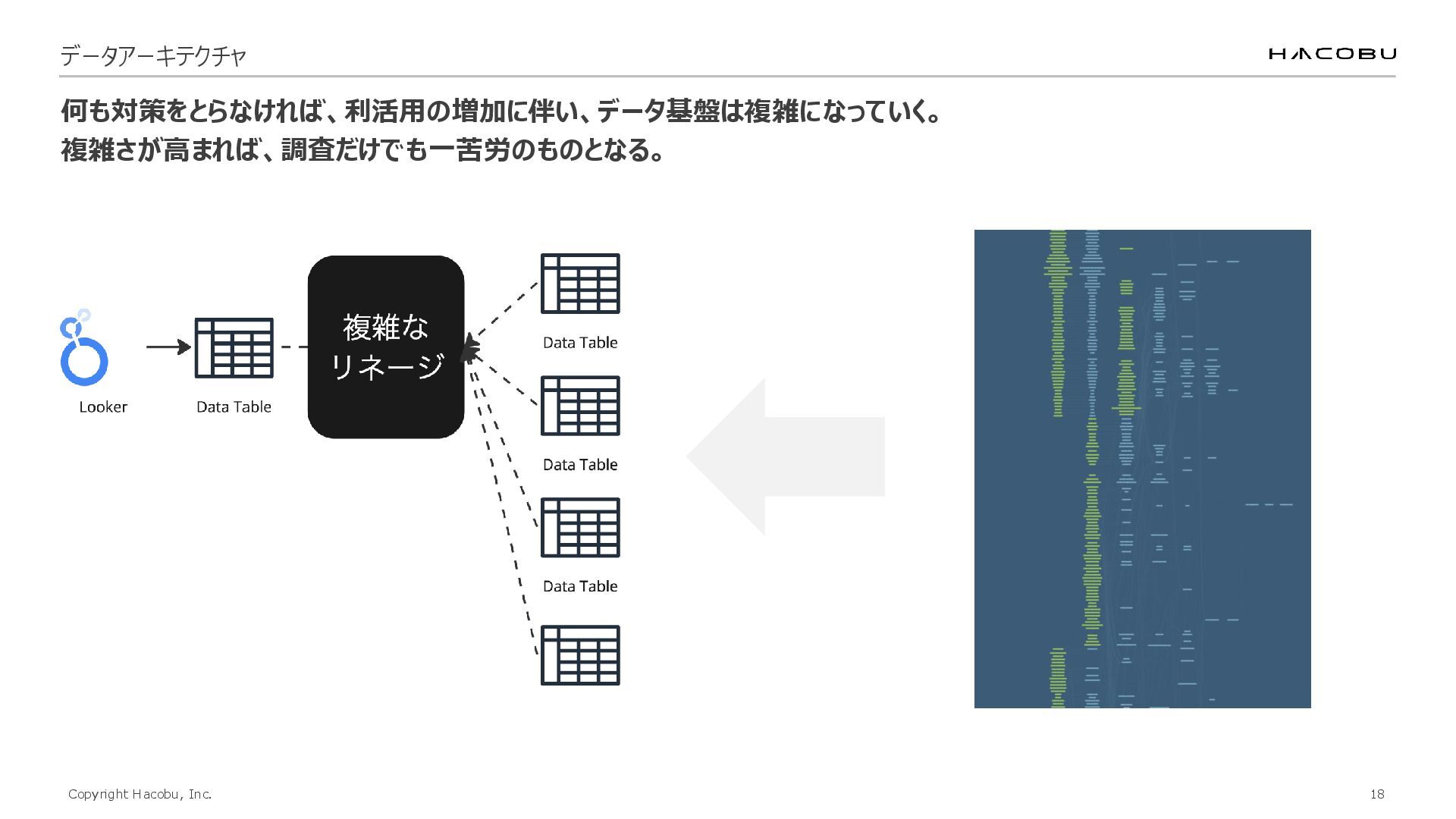 Copyright Hacobu, Inc. 17 データアーキテクチャ シンプルな構成のポイントは「複雑化・肥大化するリネージの認知負荷を下げる」ということ。