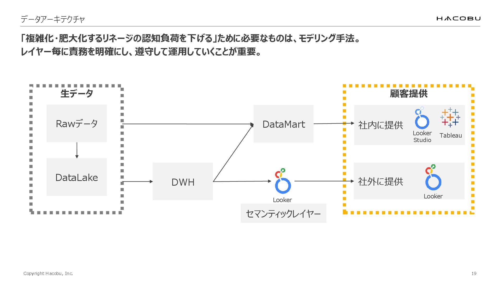 Copyright Hacobu, Inc. 19 データアーキテクチャ 「複雑化・肥大化するリネージの認知負荷を下げる」ために必要なものは、モデリング手法。 レイヤー毎に責務を明確にし、遵守して運用していくことが重要。 Rawデータ DWH DataMart