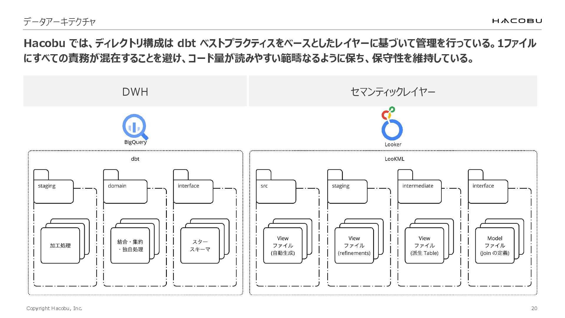 Copyright Hacobu, Inc. 20 データアーキテクチャ Hacobu では、ディレクトリ構成は dbt ベストプラクティスをベースとしたレイヤーに基づいて管理を行っている。1ファイル にすべての責務が混在することを避け、コード量が読みやすい範疇なるように保ち、保守性を維持している。