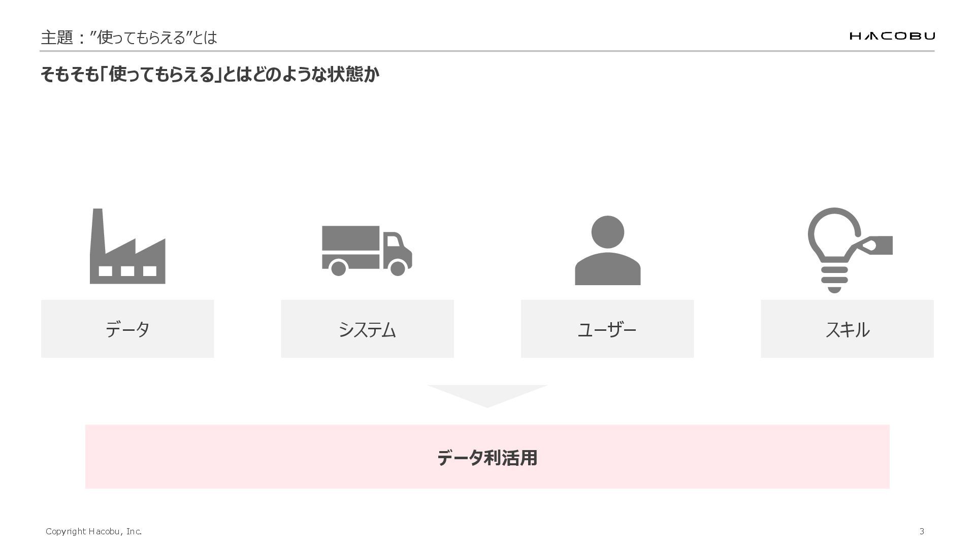 Copyright Hacobu, Inc. 3 主題:”使ってもらえる”とは そもそも「使ってもらえる」とはどのような状態か データ システム ユーザー スキル