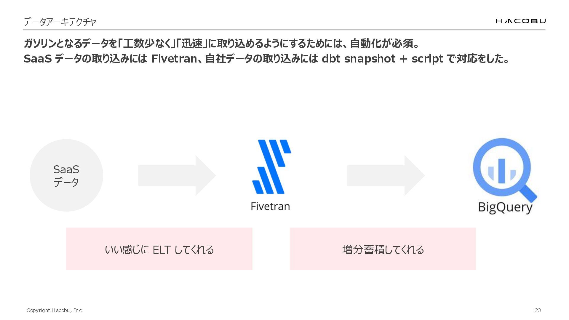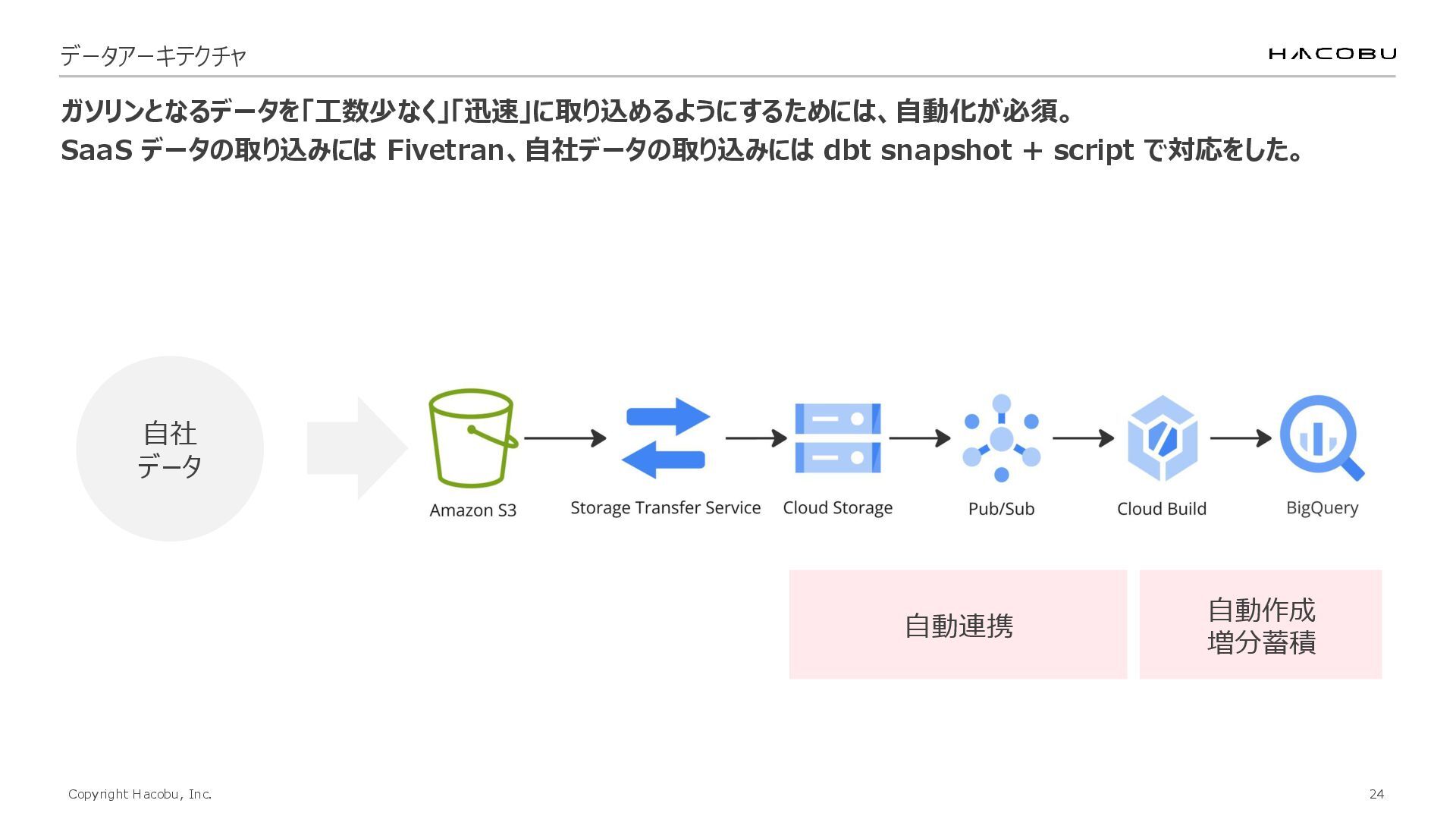 Copyright Hacobu, Inc. 23 データアーキテクチャ ガソリンとなるデータを「工数少なく」「迅速」に取り込めるようにするためには、自動化が必須。 SaaS データの取り込みには Fivetran、自社データの取り込みには dbt