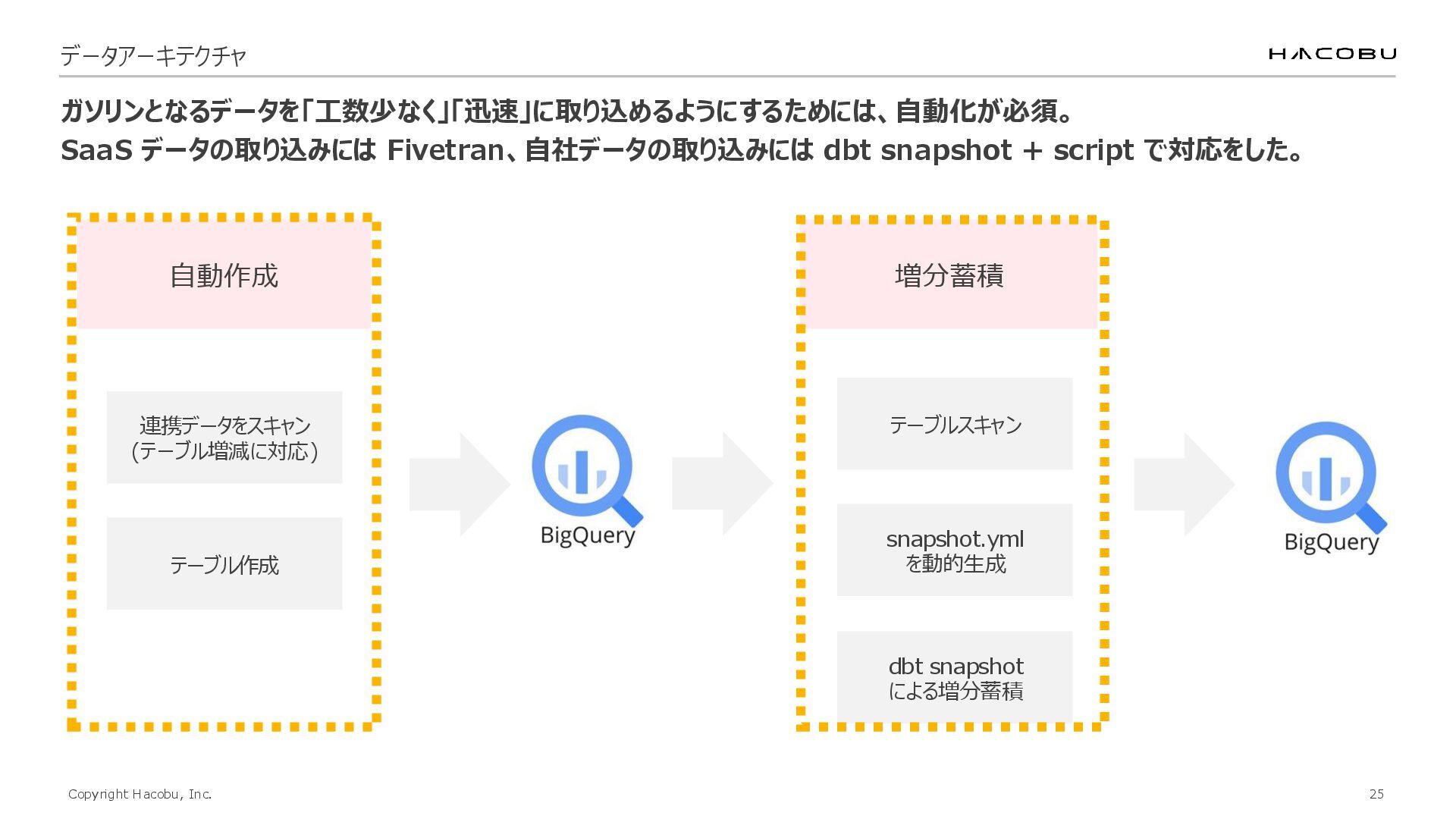 Copyright Hacobu, Inc. 24 データアーキテクチャ ガソリンとなるデータを「工数少なく」「迅速」に取り込めるようにするためには、自動化が必須。 SaaS データの取り込みには Fivetran、自社データの取り込みには dbt
