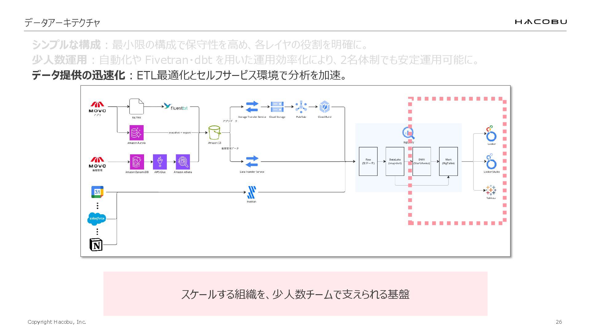 Copyright Hacobu, Inc. 25 データアーキテクチャ ガソリンとなるデータを「工数少なく」「迅速」に取り込めるようにするためには、自動化が必須。 SaaS データの取り込みには Fivetran、自社データの取り込みには dbt