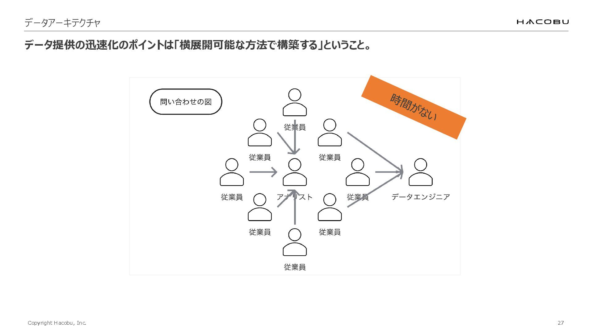 Copyright Hacobu, Inc. 26 データアーキテクチャ シンプルな構成:最小限の構成で保守性を高め、各レイヤの役割を明確に。 少人数運用:自動化や Fivetran・dbt を用いた運用効率化により、2名体制でも安定運用可能に。 データ提供の迅速化:ETL最適化とセルフサービス環境で分析を加速。