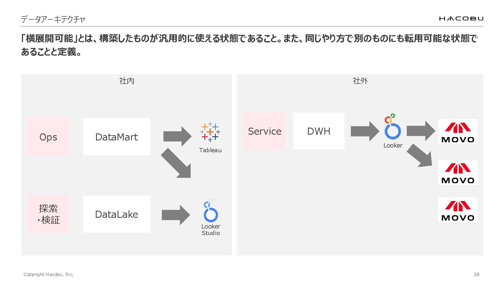 Copyright Hacobu, Inc. 27 データアーキテクチャ データ提供の迅速化のポイントは「横展開可能な方法で構築する」ということ。