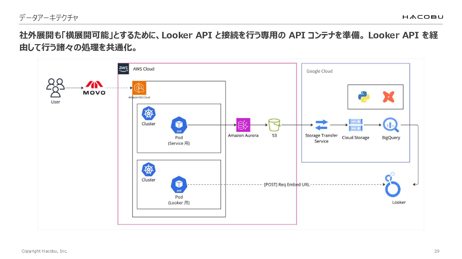 Copyright Hacobu, Inc. 29 データアーキテクチャ 社外展開も「横展開可能」とするために、Looker API と接続を行う専用の API コンテナを準備。
