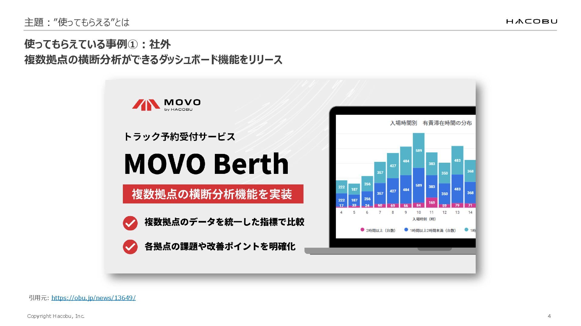 Copyright Hacobu, Inc. 4 主題:”使ってもらえる”とは 使ってもらえている事例①:社外 複数拠点の横断分析ができるダッシュボード機能をリリース 引用元: https://obu.jp/news/13649/
