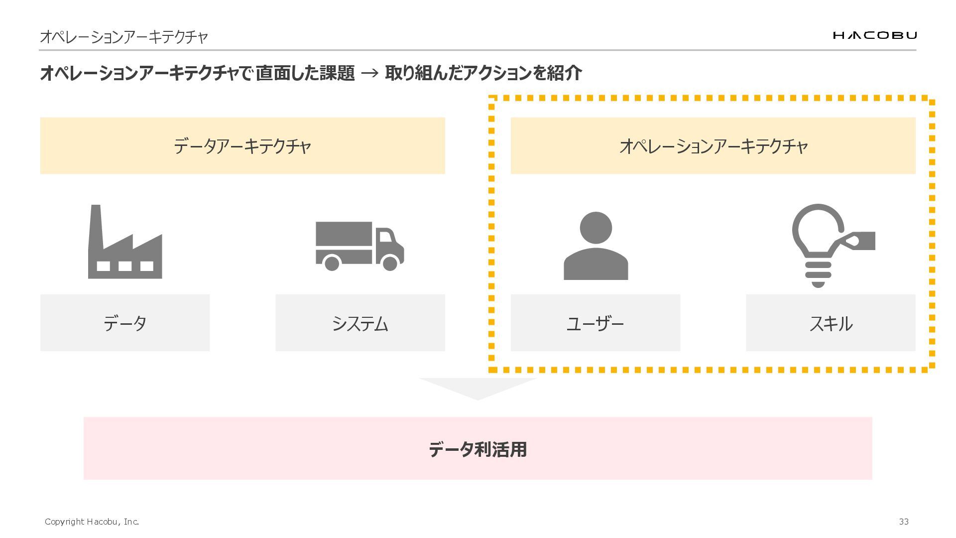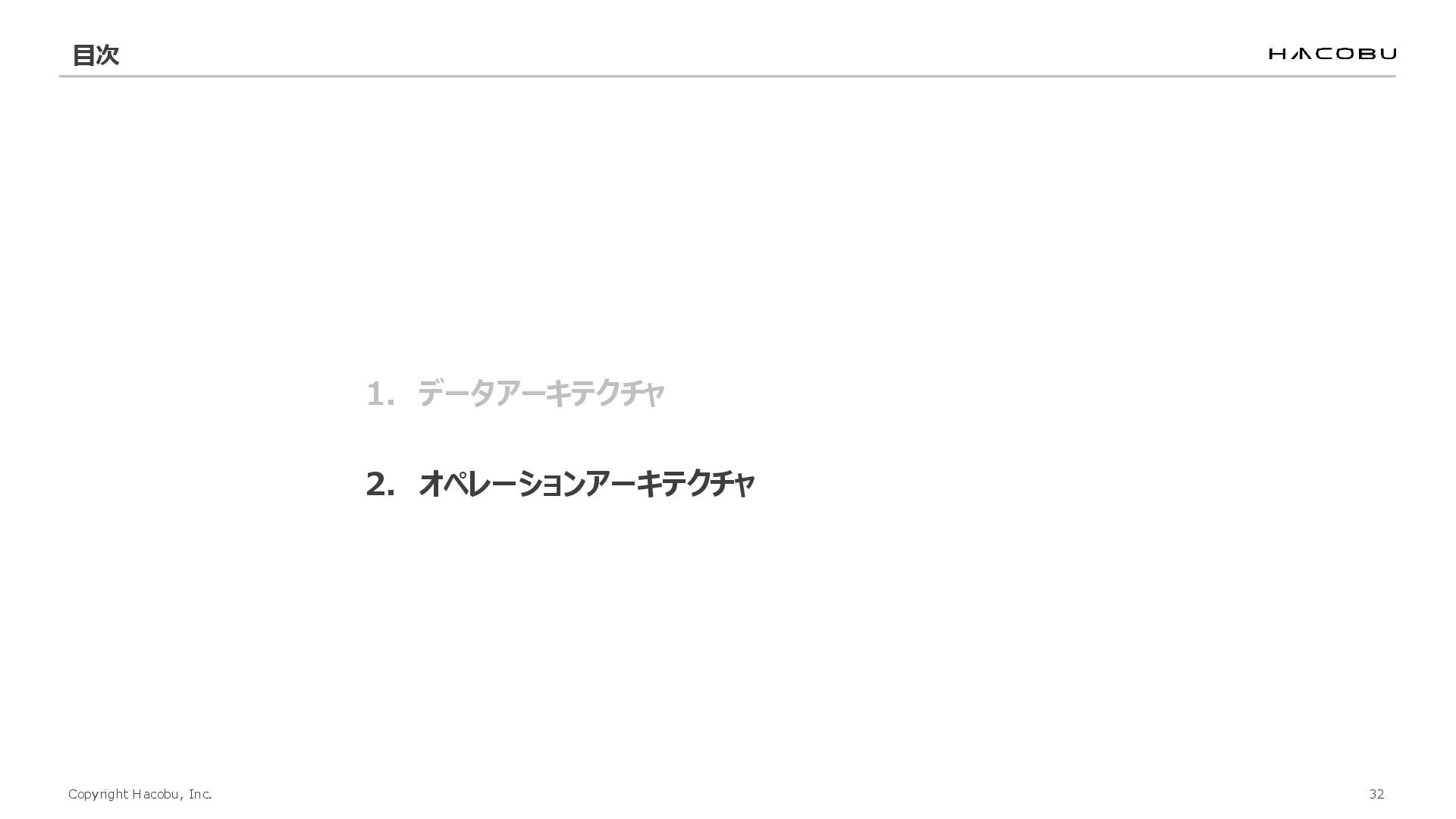 目次 Copyright Hacobu, Inc. 32 1. データアーキテクチャ 2. オペレーションアーキテクチャ