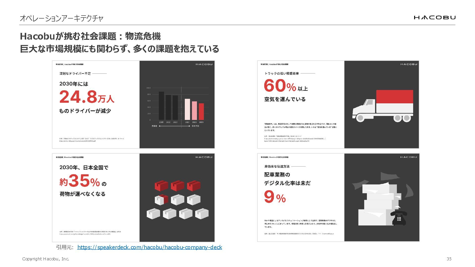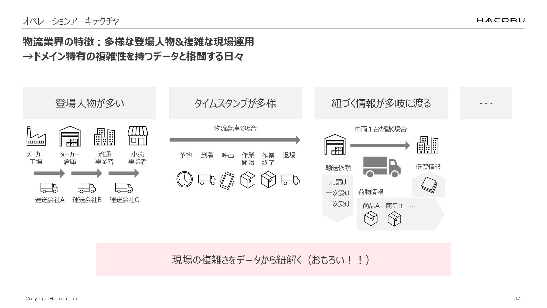 Copyright Hacobu, Inc. 36 オペレーションアーキテクチャ Hacobuが挑む社会課題:物流危機 → 物流DXツールやコンサルティング等の事業を通して、課題解決に挑戦している 引用元: https://speakerdeck.com/hacobu/hacobu-company-deck