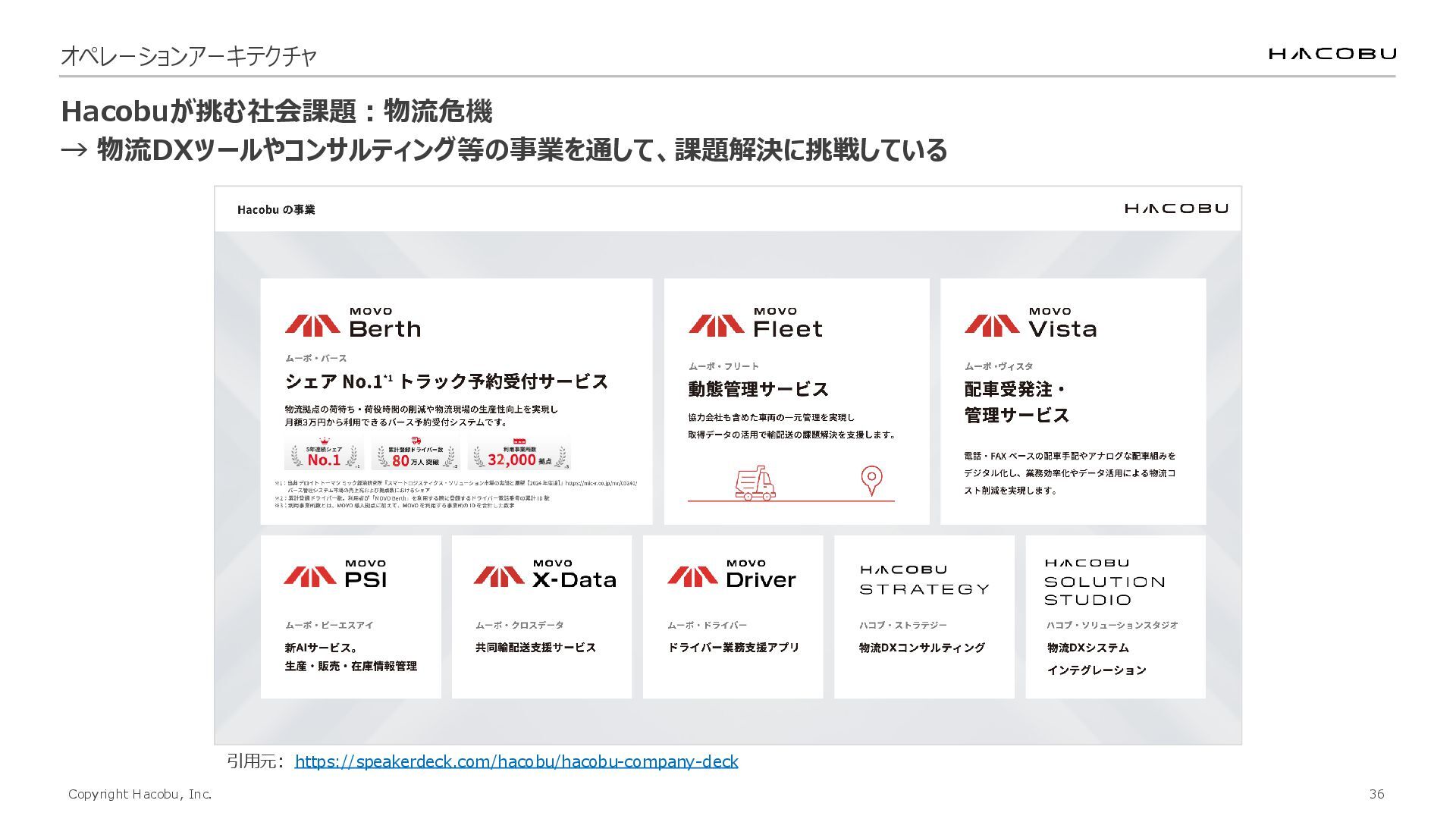 Copyright Hacobu, Inc. 35 オペレーションアーキテクチャ Hacobuが挑む社会課題:物流危機 巨大な市場規模にも関わらず、多くの課題を抱えている 引用元: https://speakerdeck.com/hacobu/hacobu-company-deck