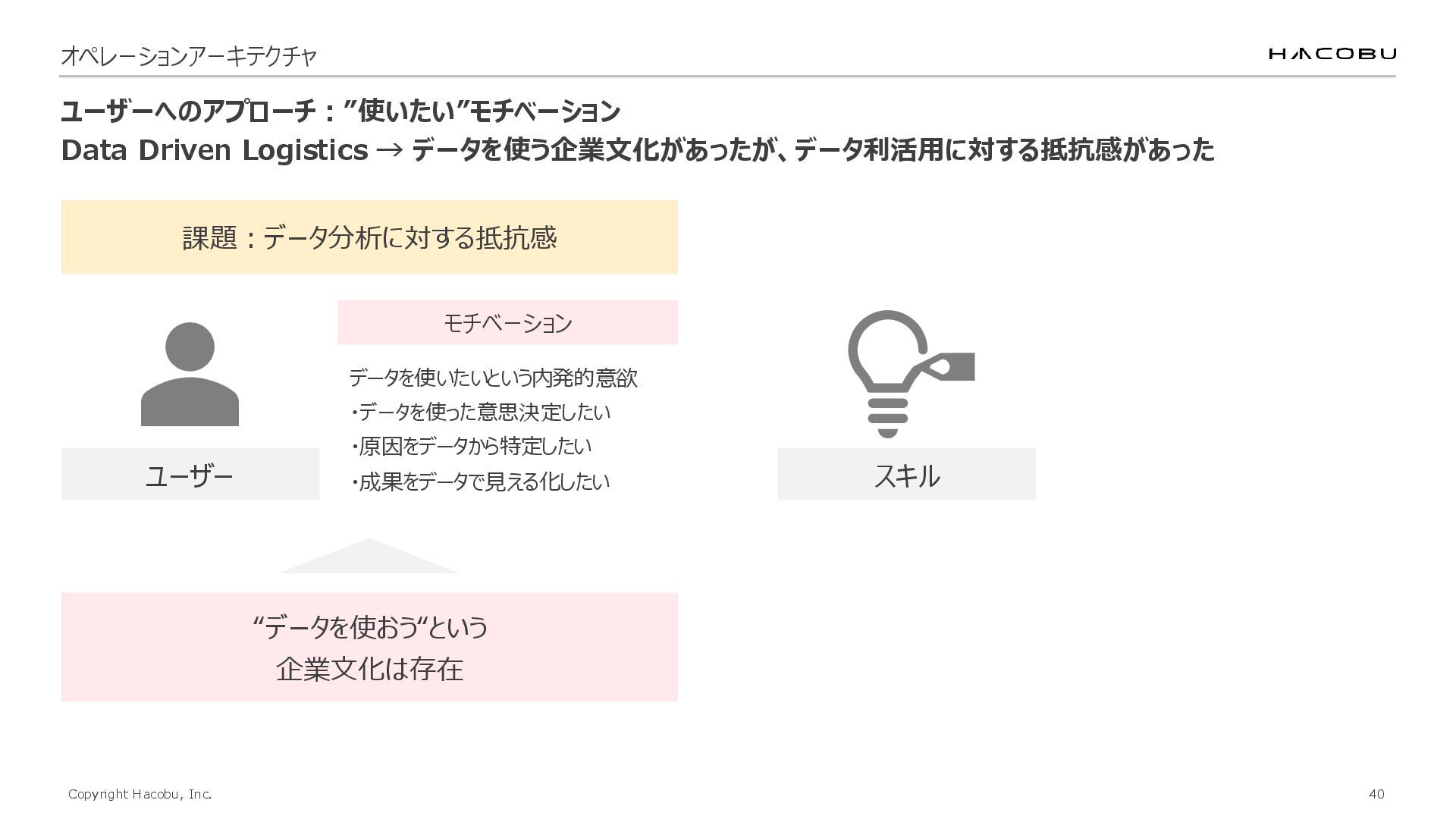 Copyright Hacobu, Inc. 39 オペレーションアーキテクチャ そんなデータを”使ってもらう”ための「オペレーションアーキテクチャ」としての取り組みを紹介 データ システム ユーザー スキル