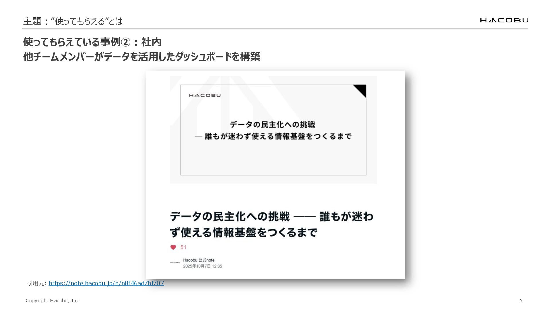 Copyright Hacobu, Inc. 5 主題:”使ってもらえる”とは 使ってもらえている事例②:社内 他チームメンバーがデータを活用したダッシュボードを構築 引用元: https://note.hacobu.jp/n/n8f46ad7bf707