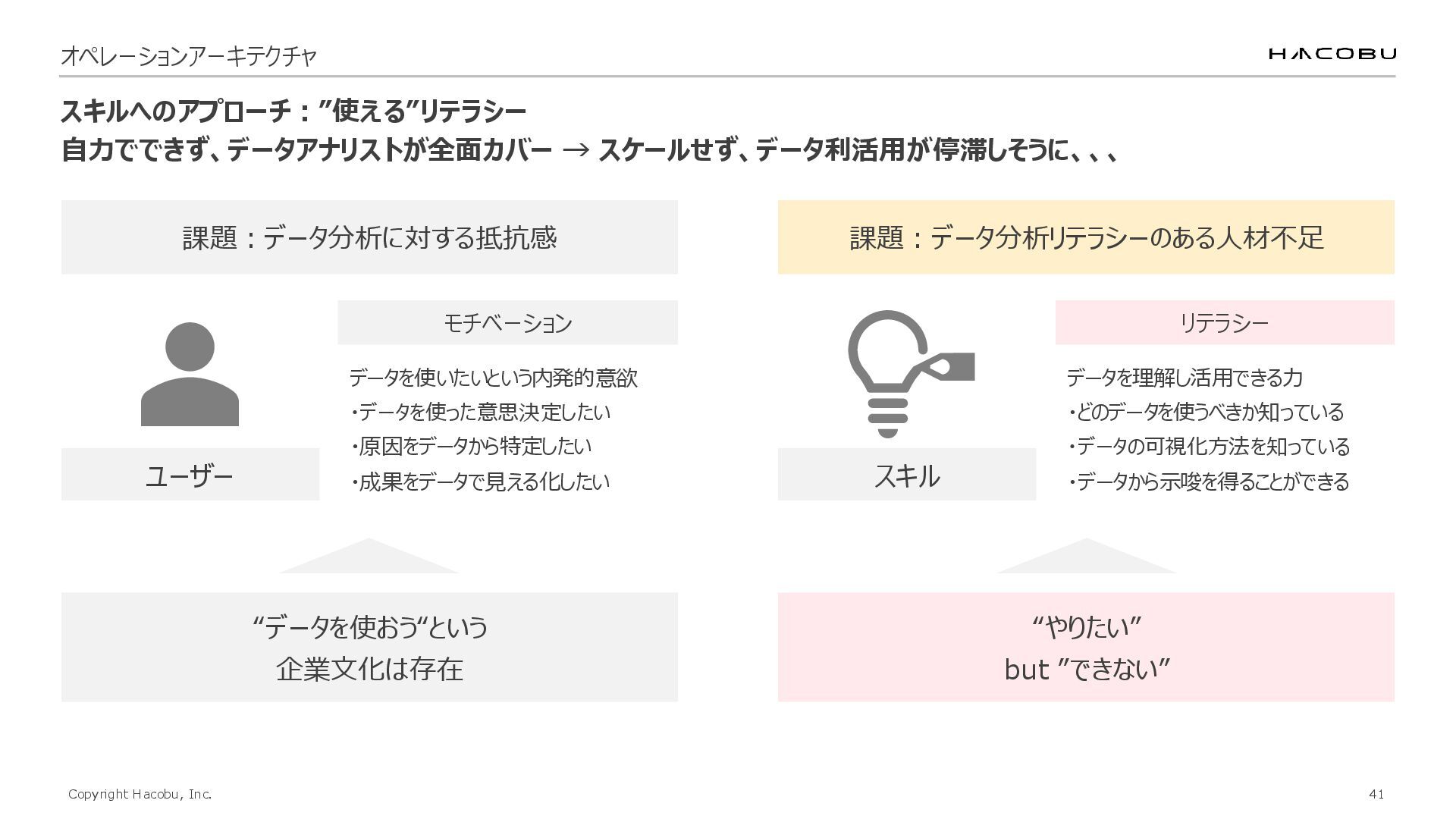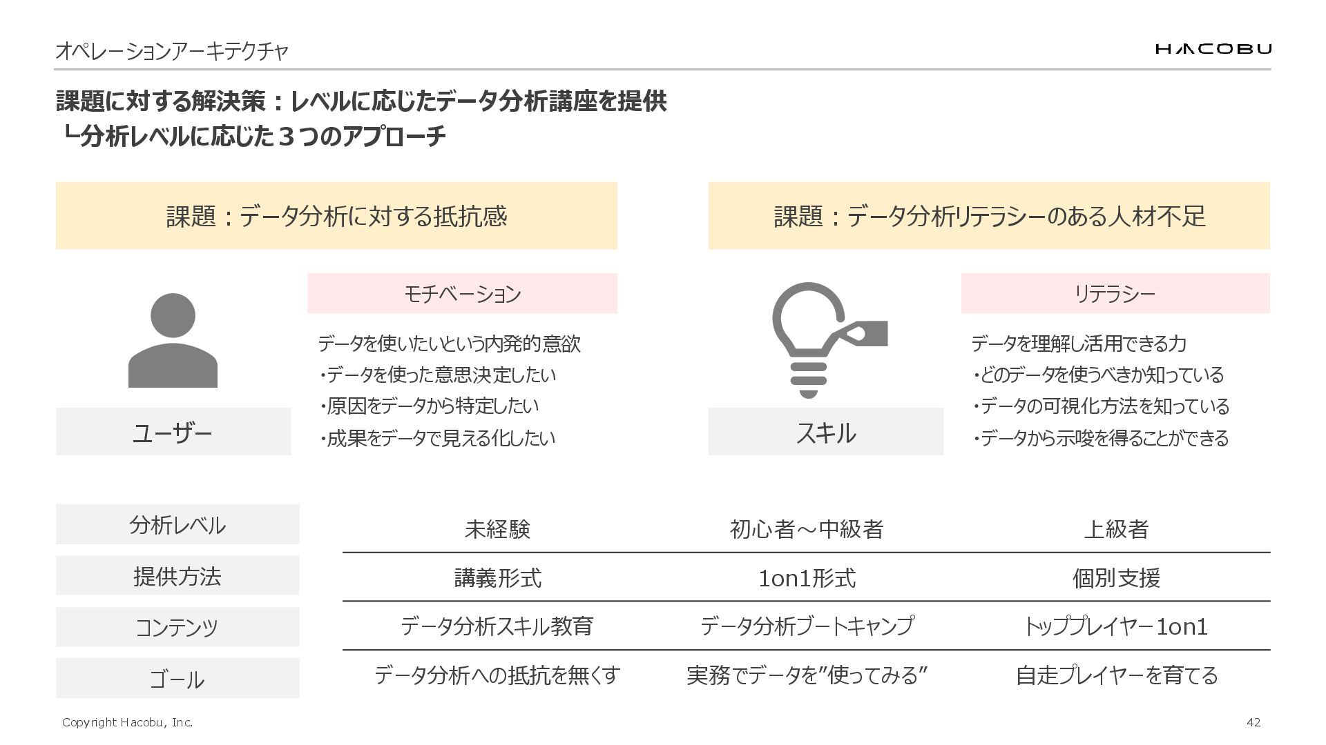 Copyright Hacobu, Inc. 41 オペレーションアーキテクチャ スキルへのアプローチ:”使える”リテラシー 自力でできず、データアナリストが全面カバー → スケールせず、データ利活用が停滞しそうに、、、 モチベーション