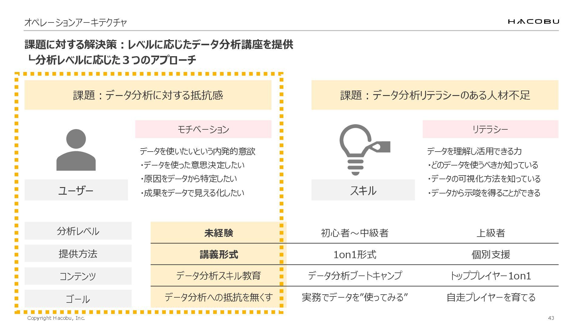 Copyright Hacobu, Inc. 42 オペレーションアーキテクチャ 課題に対する解決策:レベルに応じたデータ分析講座を提供 ┗分析レベルに応じた3つのアプローチ スキル リテラシー データを理解し活用できる力