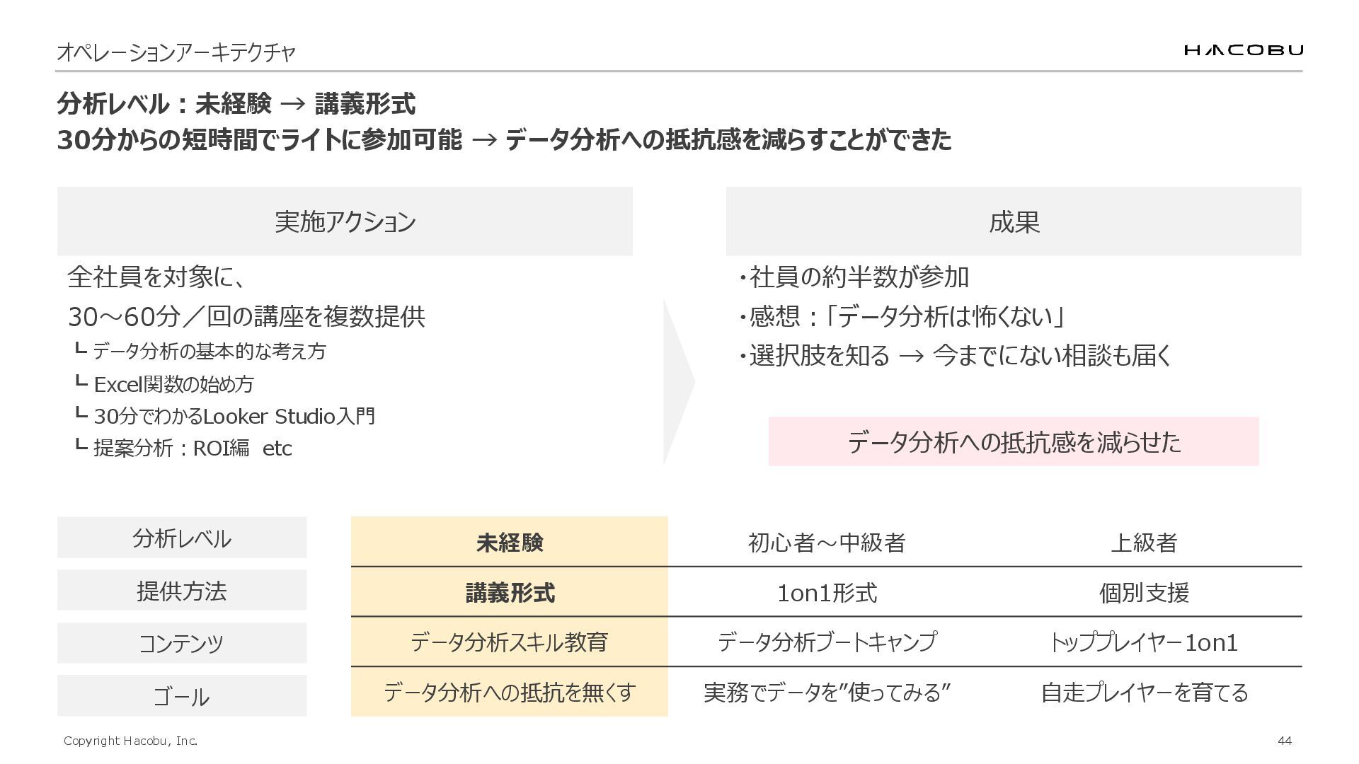 Copyright Hacobu, Inc. 43 オペレーションアーキテクチャ 課題に対する解決策:レベルに応じたデータ分析講座を提供 ┗分析レベルに応じた3つのアプローチ スキル リテラシー データを理解し活用できる力