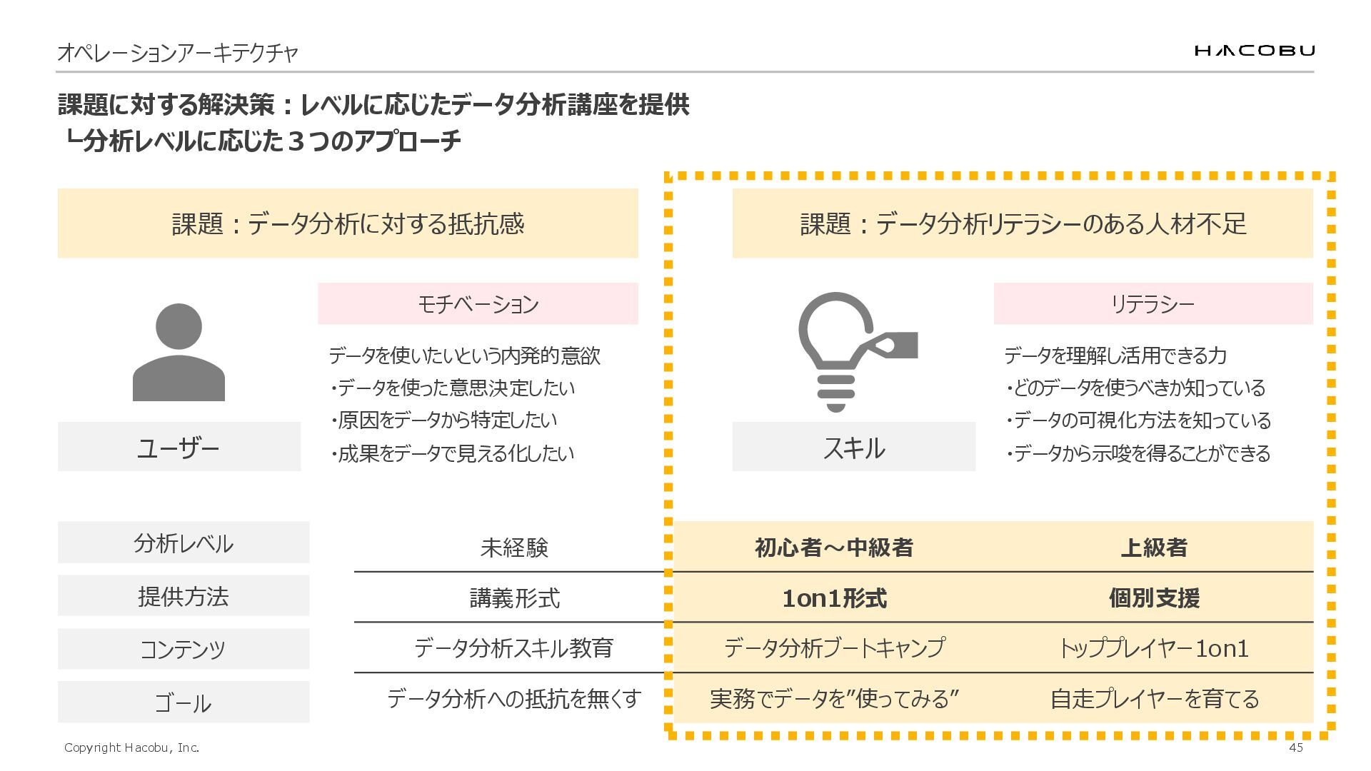 Copyright Hacobu, Inc. 44 オペレーションアーキテクチャ 分析レベル:未経験 → 講義形式 30分からの短時間でライトに参加可能 →