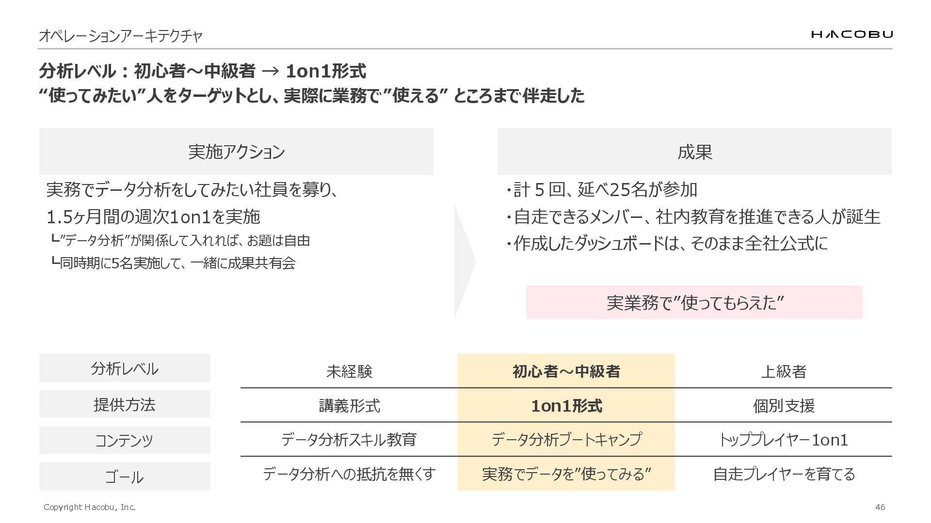 Copyright Hacobu, Inc. 45 オペレーションアーキテクチャ 課題に対する解決策:レベルに応じたデータ分析講座を提供 ┗分析レベルに応じた3つのアプローチ スキル リテラシー データを理解し活用できる力