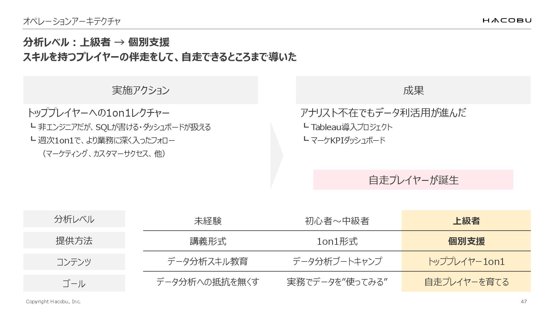 Copyright Hacobu, Inc. 46 オペレーションアーキテクチャ 分析レベル:初心者〜中級者 → 1on1形式 “使ってみたい”人をターゲットとし、実際に業務で”使える” ところまで伴走した