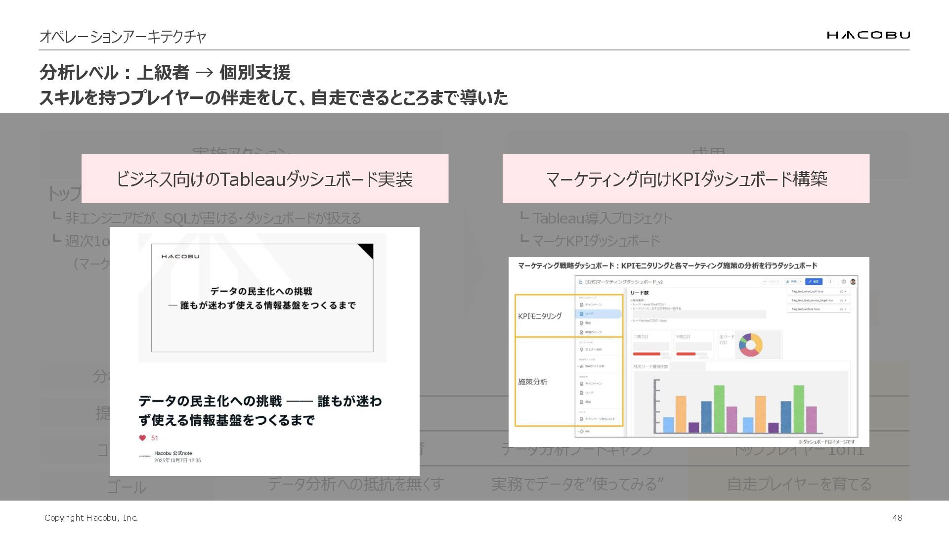 Copyright Hacobu, Inc. 47 オペレーションアーキテクチャ 分析レベル:上級者 → 個別支援 スキルを持つプレイヤーの伴走をして、自走できるところまで導いた 分析レベル