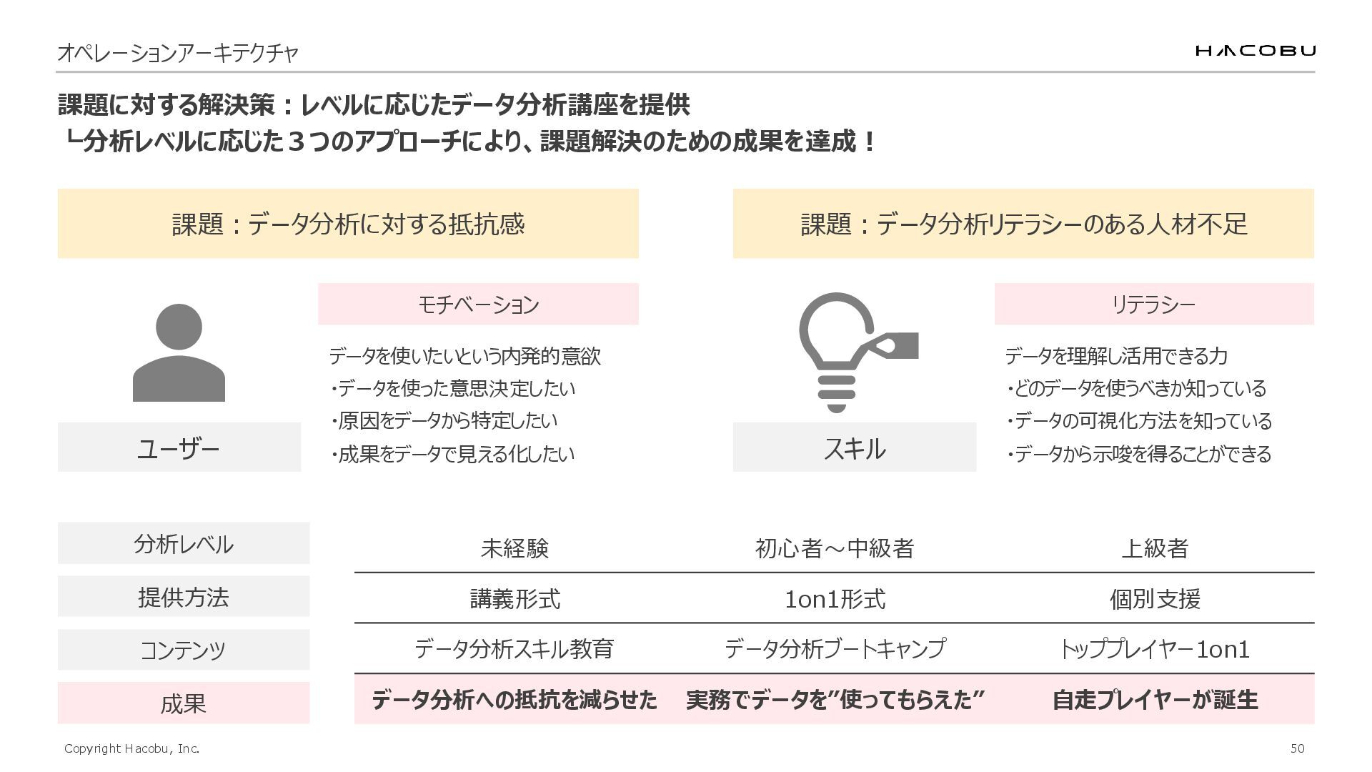 Copyright Hacobu, Inc. 50 オペレーションアーキテクチャ 課題に対する解決策:レベルに応じたデータ分析講座を提供 ┗分析レベルに応じた3つのアプローチにより、課題解決のための成果を達成! スキル リテラシー データを理解し活用できる力
