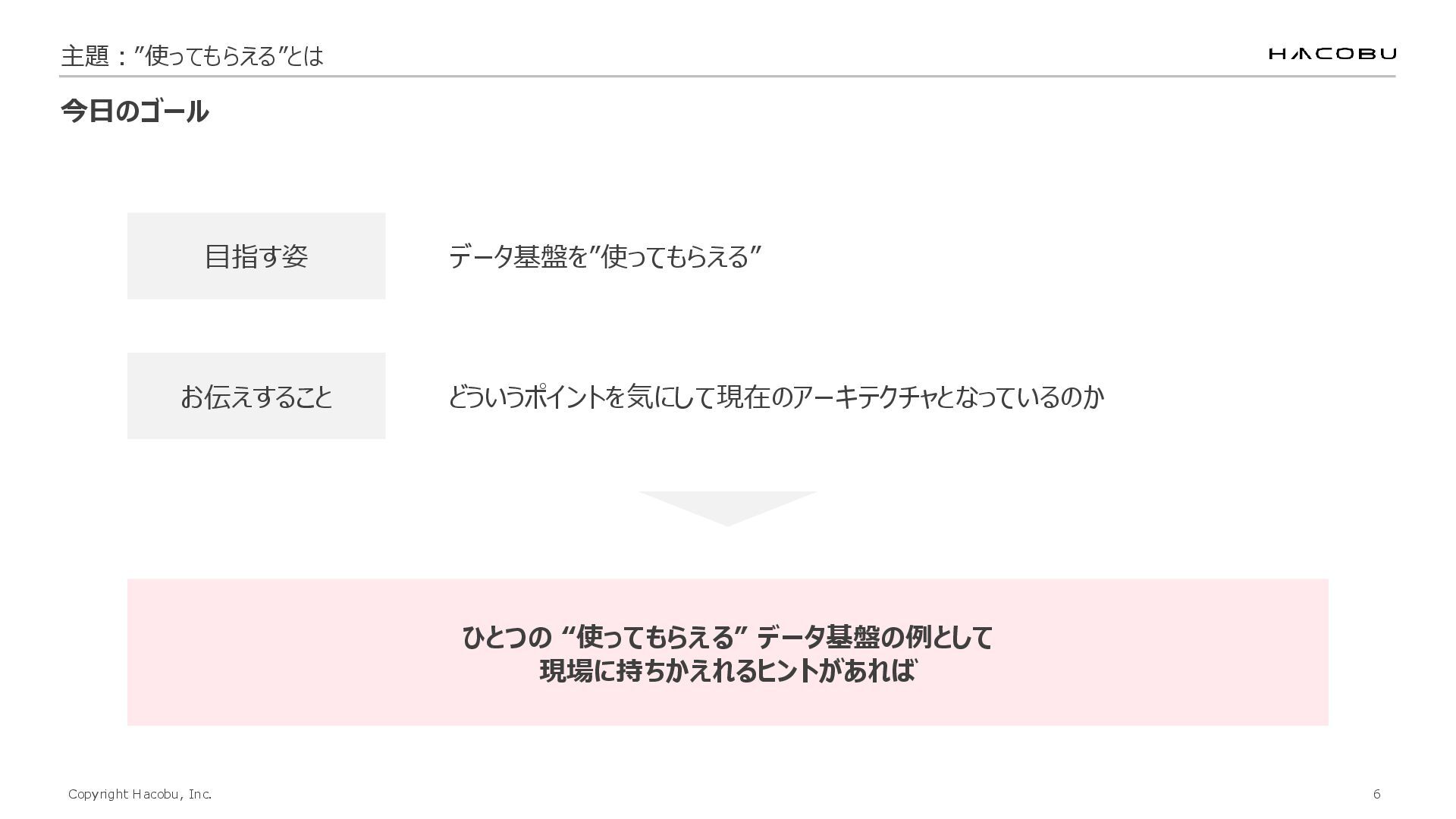 目指す姿 データ基盤を”使ってもらえる” お伝えすること どういうポイントを気にして現在のアーキテクチャとなっているのか
