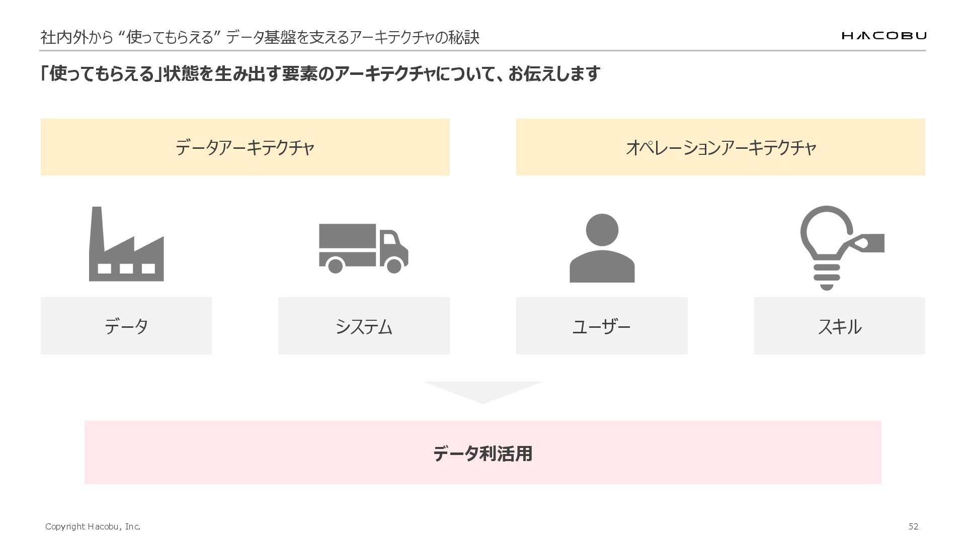 Copyright Hacobu, Inc. 52 社内外から “使ってもらえる” データ基盤を支えるアーキテクチャの秘訣 「使ってもらえる」状態を生み出す要素のアーキテクチャについて、お伝えします データ システム