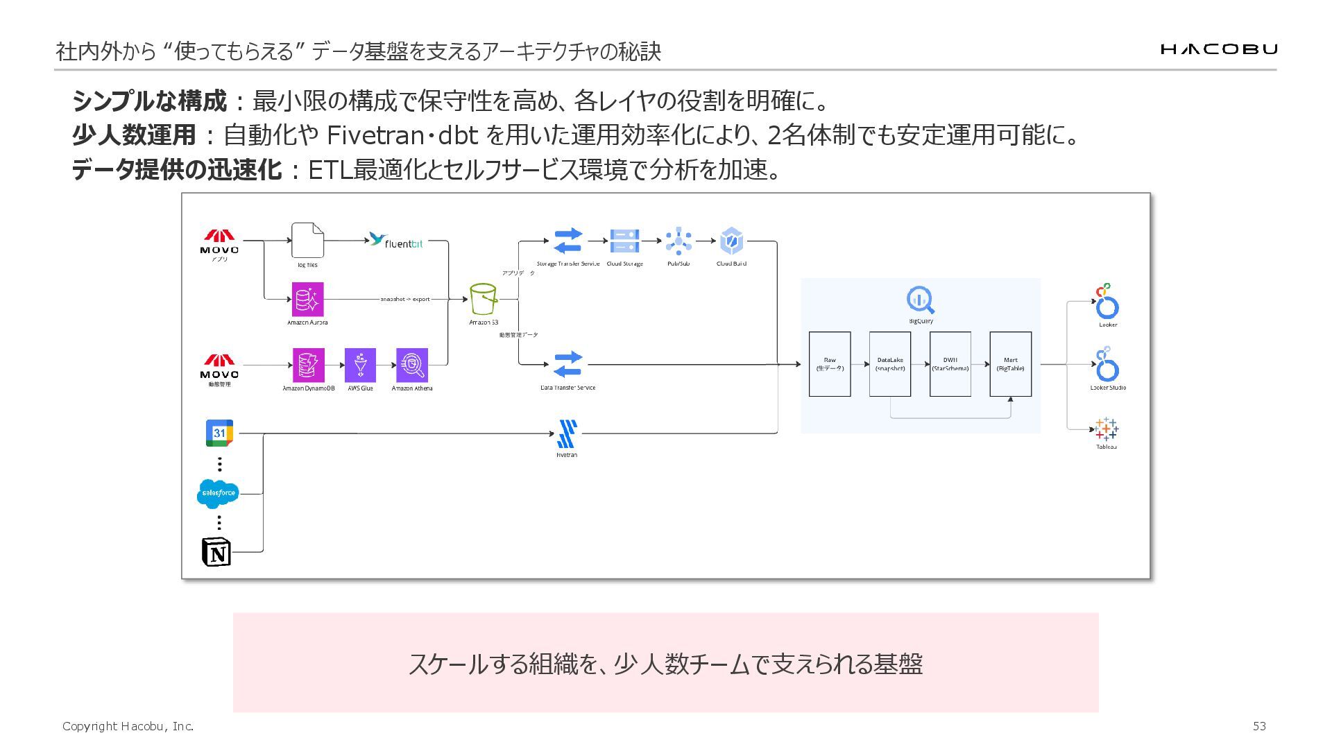 Copyright Hacobu, Inc. 53 社内外から “使ってもらえる” データ基盤を支えるアーキテクチャの秘訣 シンプルな構成:最小限の構成で保守性を高め、各レイヤの役割を明確に。 少人数運用:自動化や Fivetran・dbt