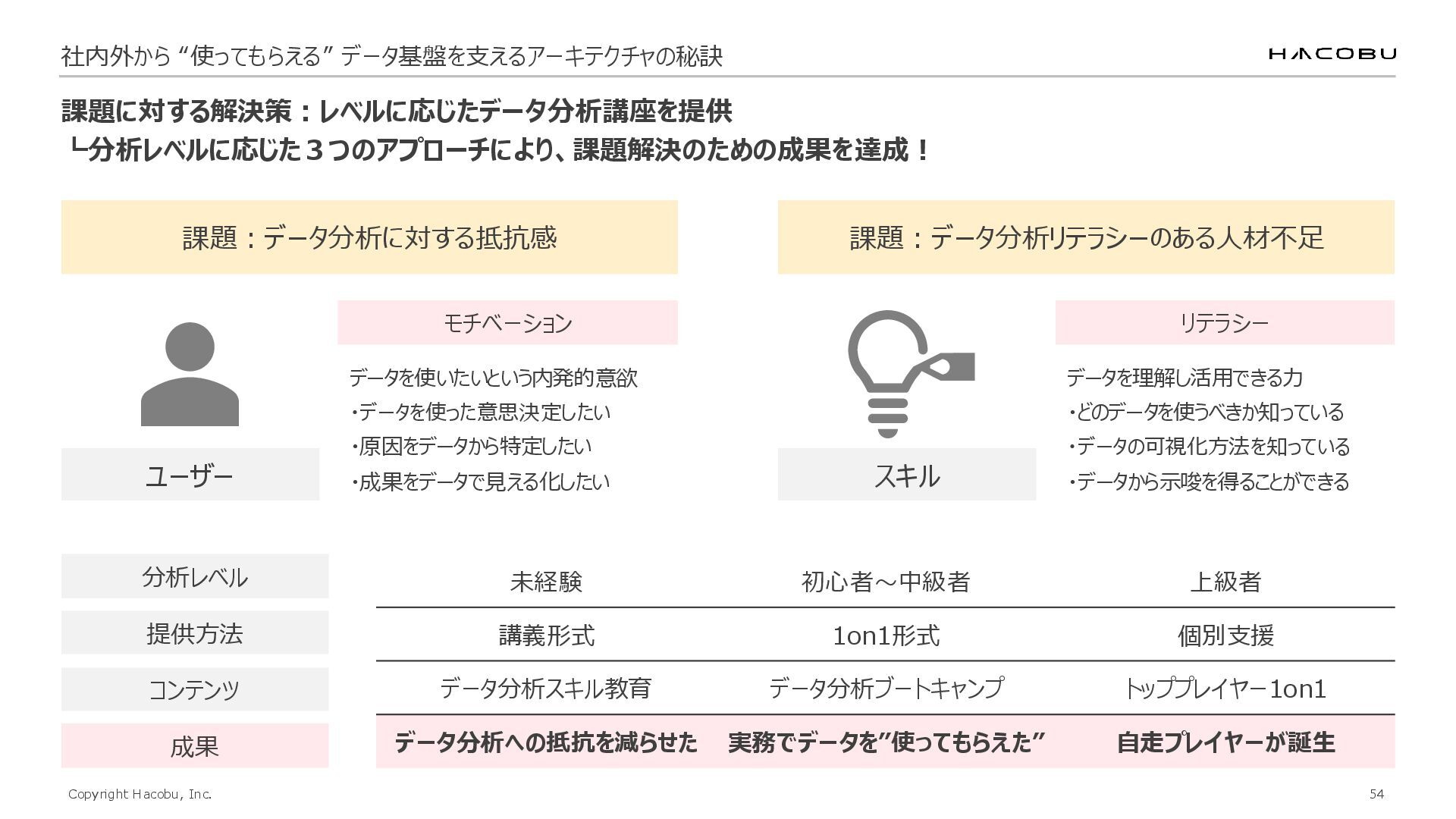 Copyright Hacobu, Inc. 54 社内外から “使ってもらえる” データ基盤を支えるアーキテクチャの秘訣 課題に対する解決策:レベルに応じたデータ分析講座を提供 ┗分析レベルに応じた3つのアプローチにより、課題解決のための成果を達成! スキル
