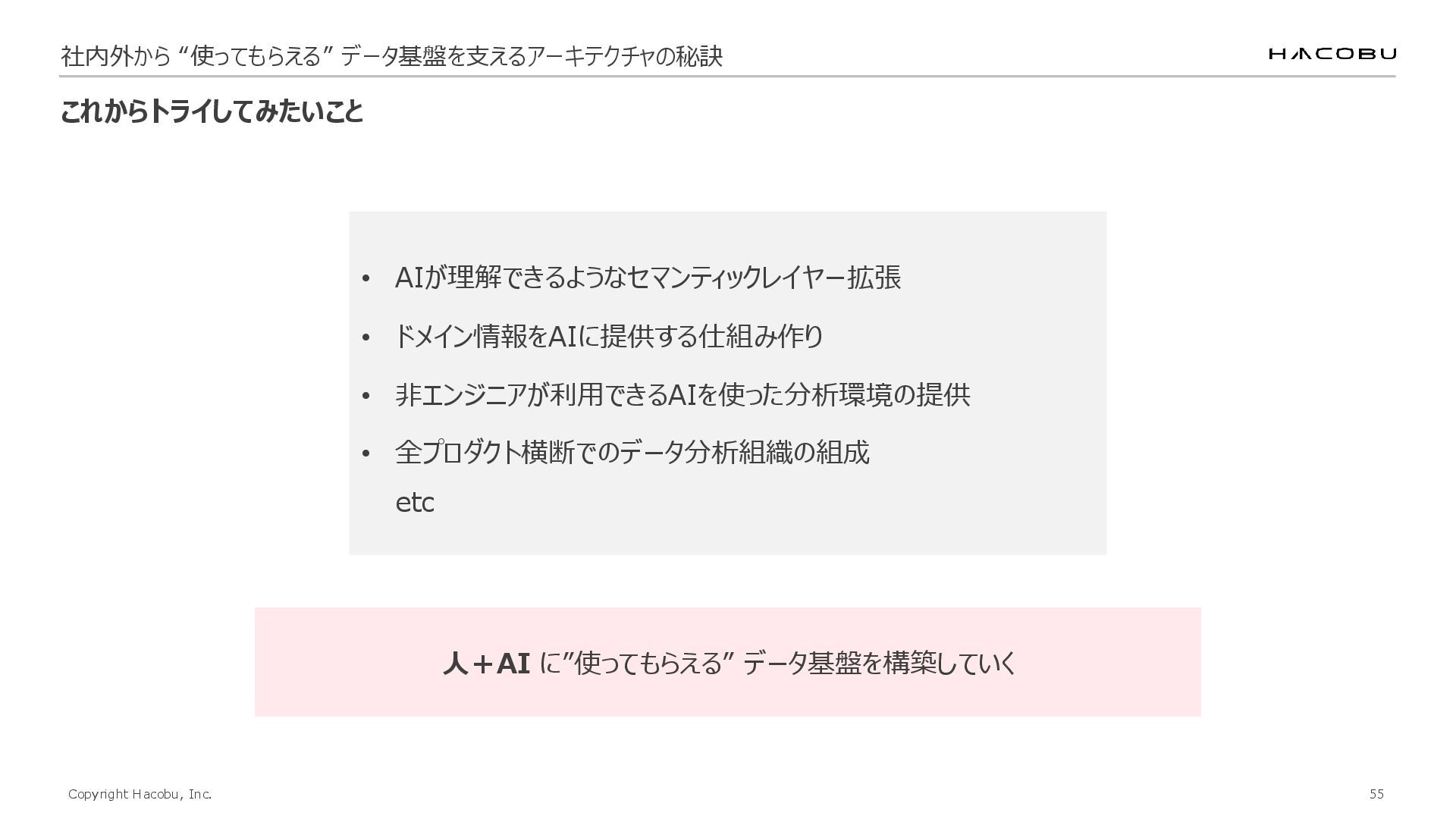Copyright Hacobu, Inc. 55 社内外から “使ってもらえる” データ基盤を支えるアーキテクチャの秘訣 これからトライしてみたいこと • AIが理解できるようなセマンティックレイヤー拡張