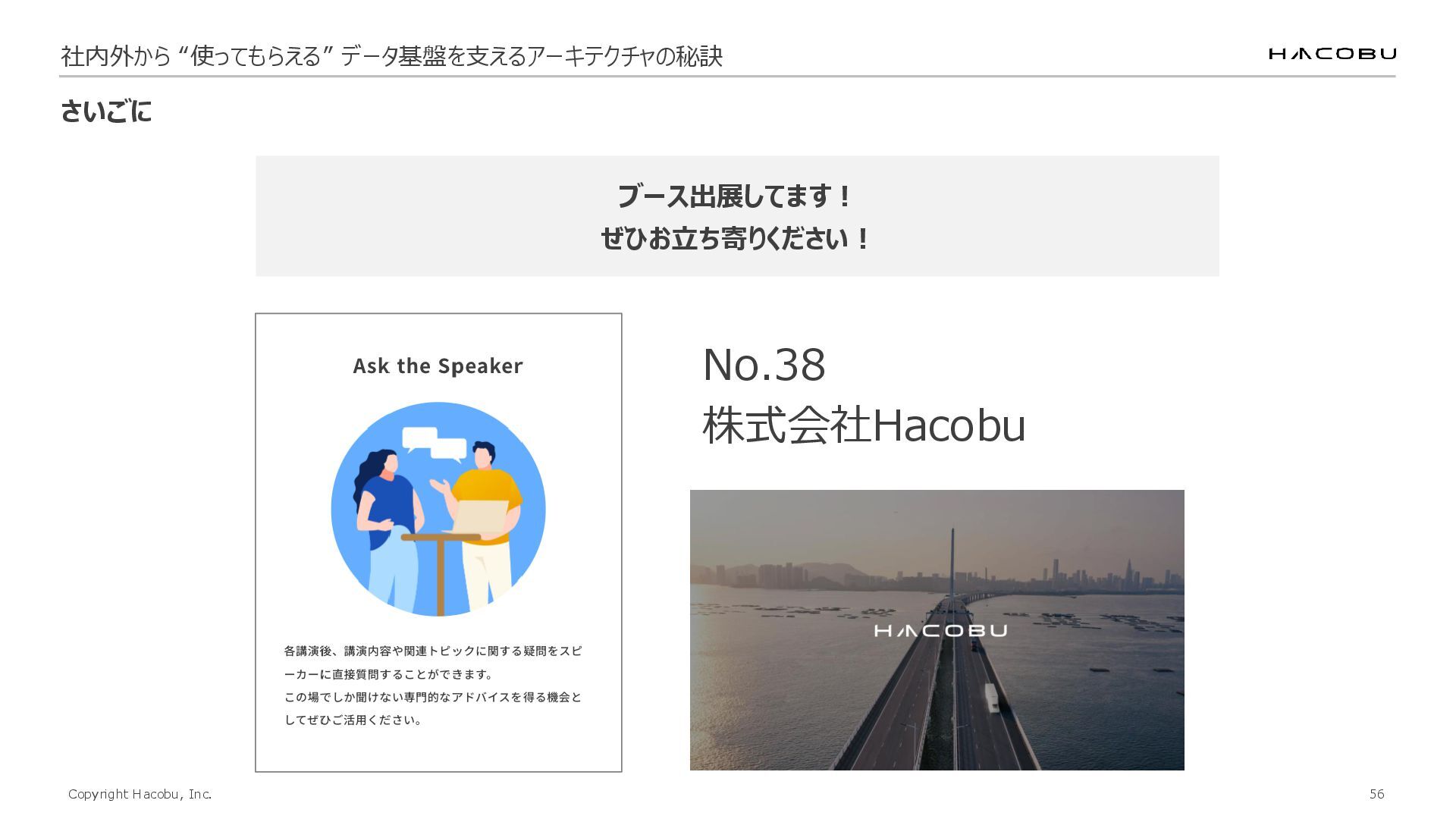 Copyright Hacobu, Inc. 56 社内外から “使ってもらえる” データ基盤を支えるアーキテクチャの秘訣 さいごに ブース出展してます! ぜひお立ち寄りください!