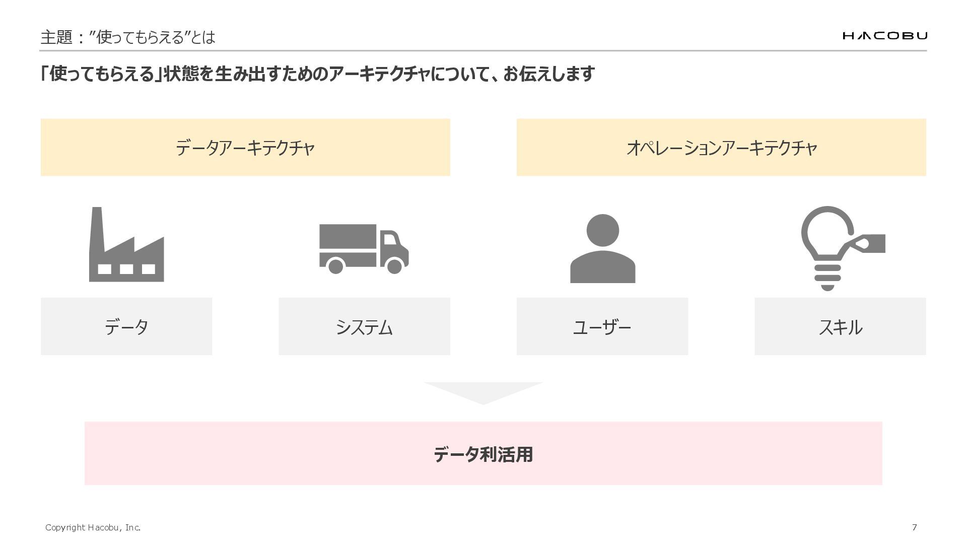 Copyright Hacobu, Inc. 6 主題:”使ってもらえる”とは 今日のゴール ひとつの “使ってもらえる” データ基盤の例として 現場に持ちかえれるヒントがあれば